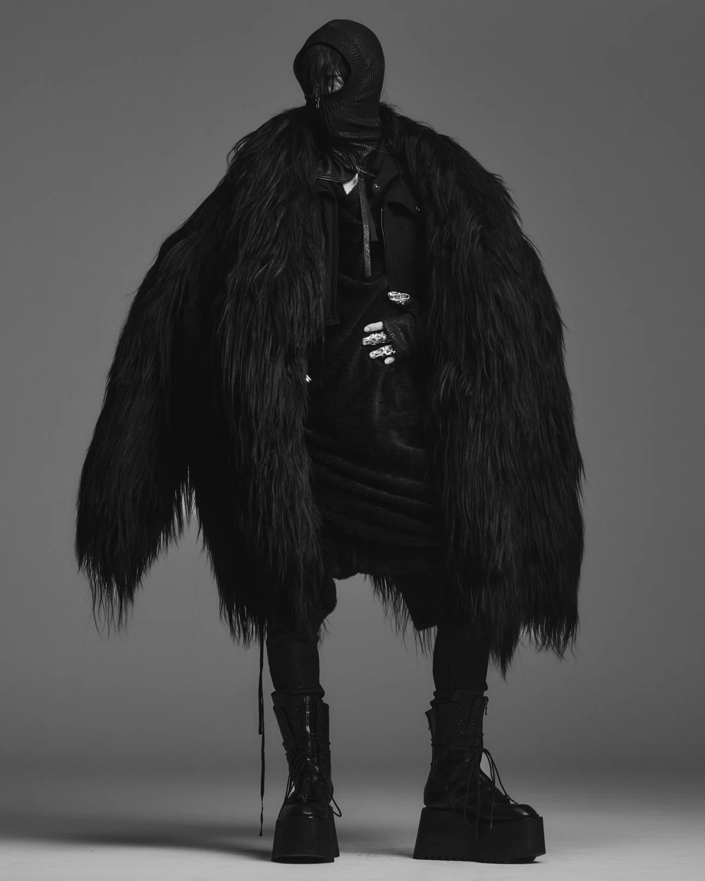 タイトにまとめたヘアと合わせれば、ボリューミーなシルエットに鮮やかなコントラストが生まれ、全身の印象が一段とモードに。パンツやブーツをシャープに整えることで、ファーの華やかさが際立ち、ただのラグジュアリーにとどまらない“攻めのスタイリング”へと昇華する。
