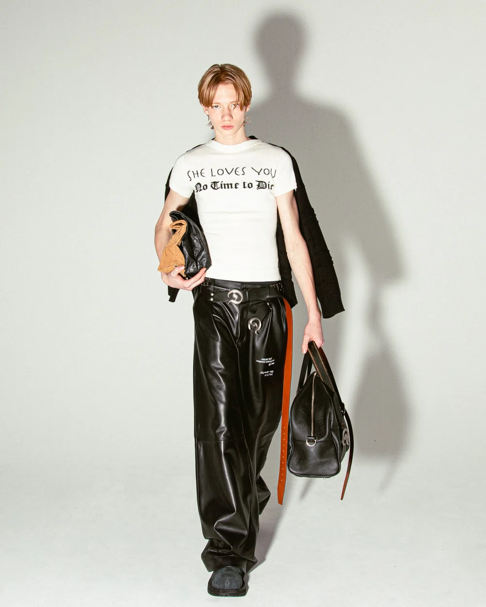 さらに注目したいのは、レザー×レザーのスタイリング。マットとグロス、硬さと柔らかさといった素材のニュアンスを掛け合わせることで、単なるハードさにとどまらず、強さと官能が溶け合うスタイルへと進化する。