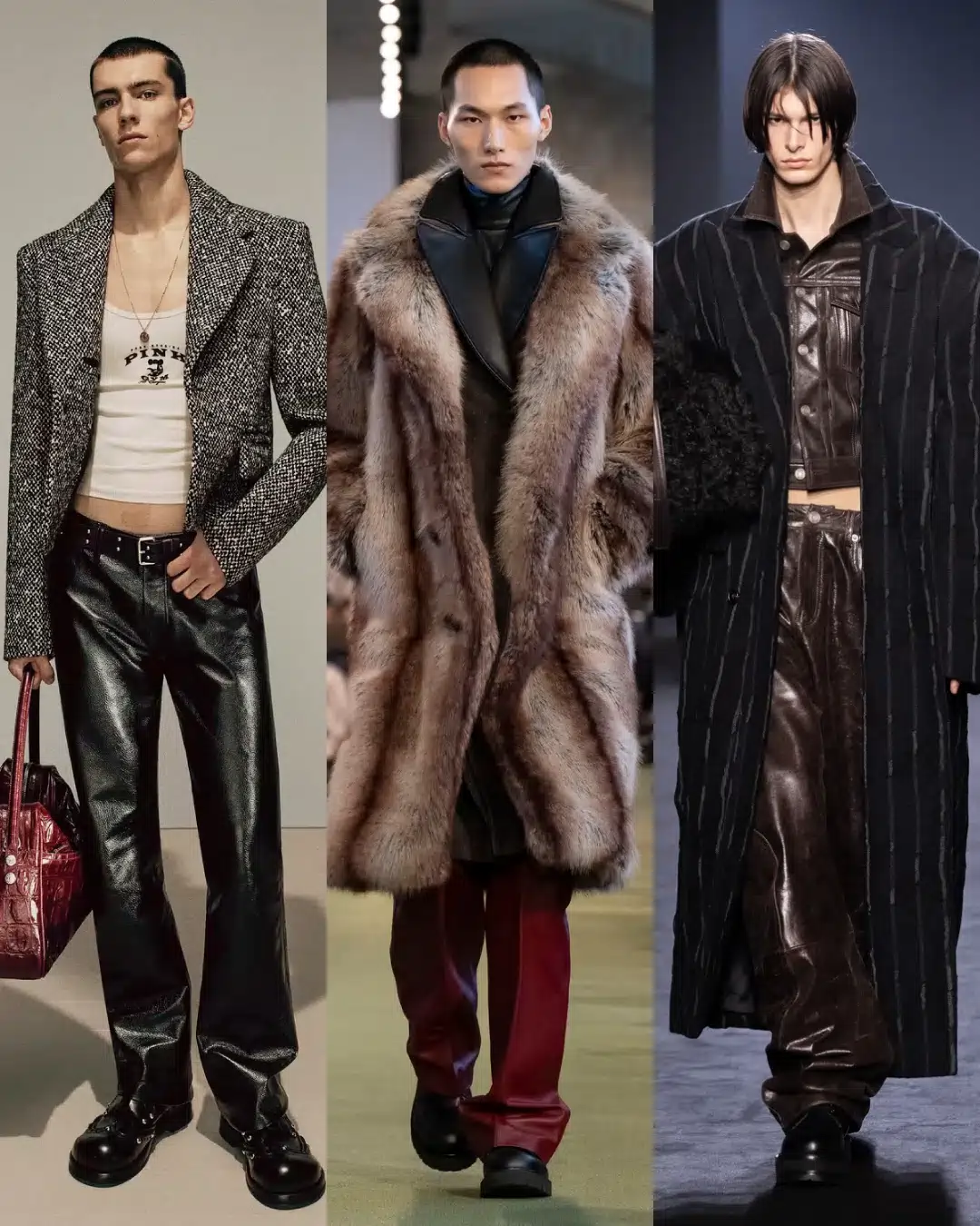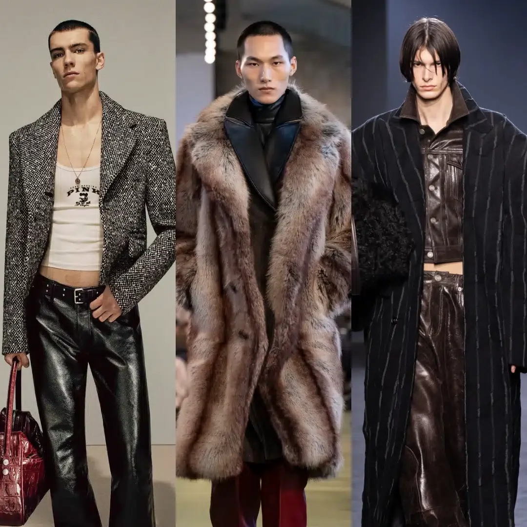 2025年秋冬のランウェイで際立ったのは、強さに官能を重ねたスタイル。その濃厚なムードを「艶やかマスキュリン」と呼ぶなら、パワースーツやレザー、ファー、アニマル柄といったアイテムが象徴的だ。挑発的でグラマラスな存在感は、ジェンダーを超える時代の流れとも響き合い、メンズスタイルを新たな地平へ導いている。