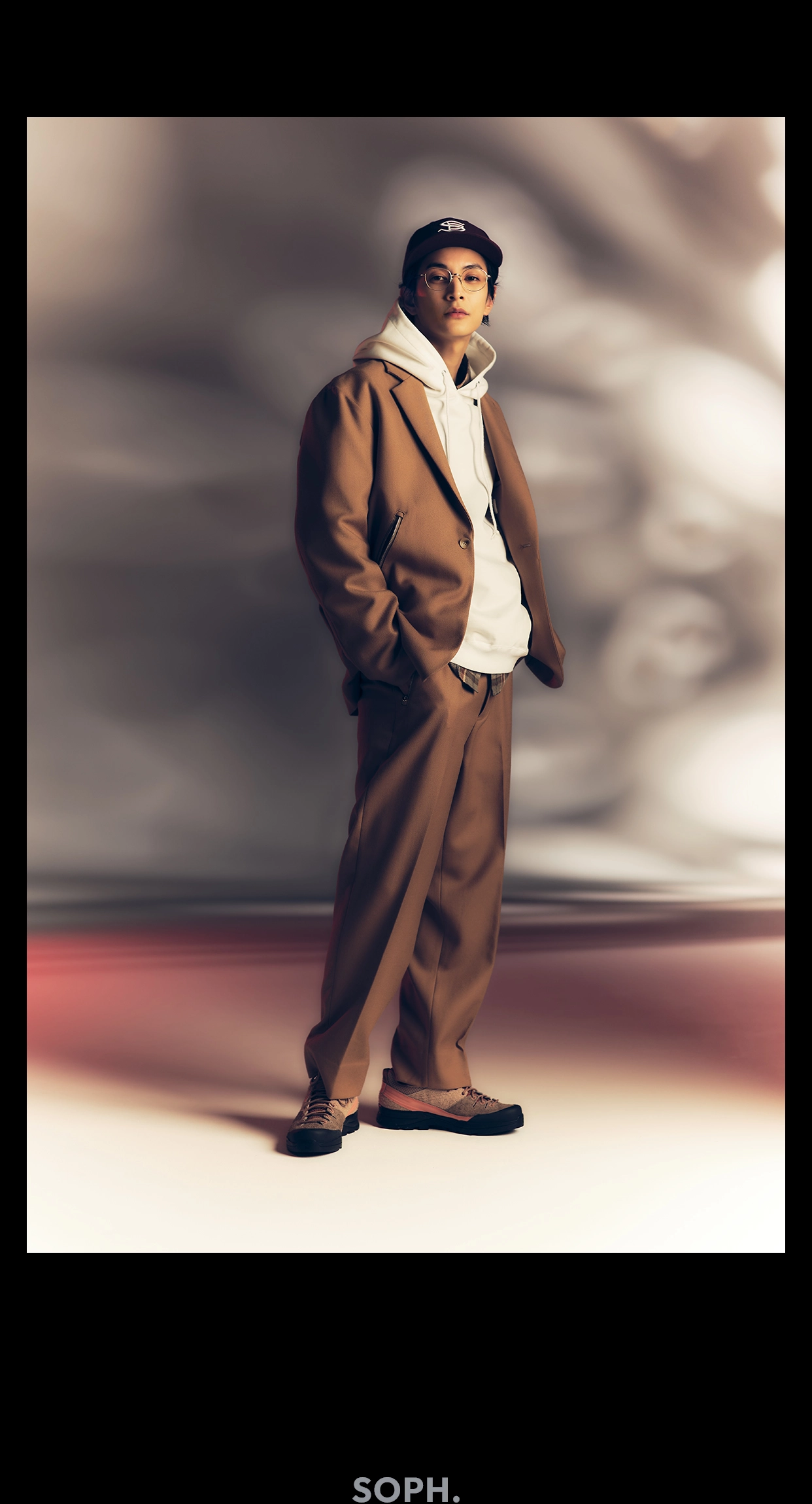 ジップポケットを特徴とした新作の1つボタンジャケット。ボタン位置を高めにすることで立体感のあるボックスシルエットを生み出している。レトロ感が漂うドライウール素材は程よく厚みがあるのでハリとコシにも優れている。合わせるパンツはテーパードをおさえてワイド感を強調したニューシルエット。