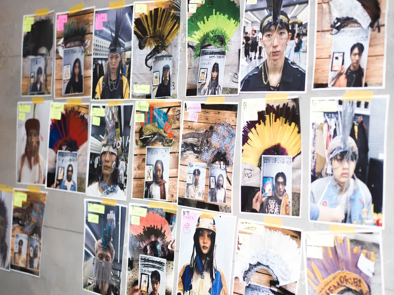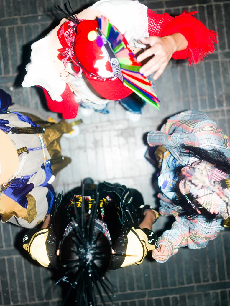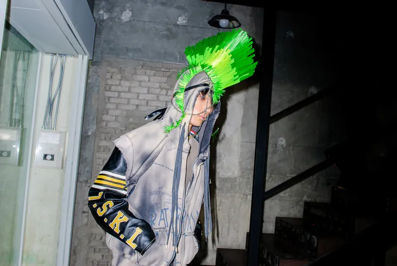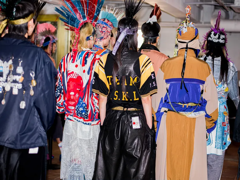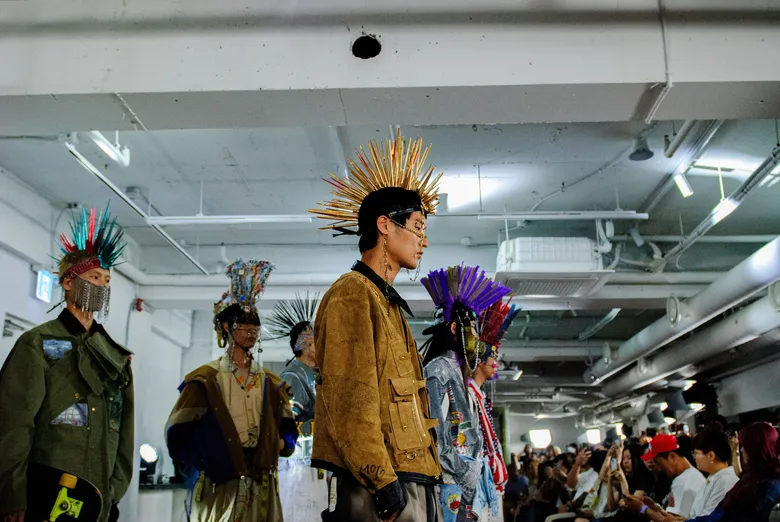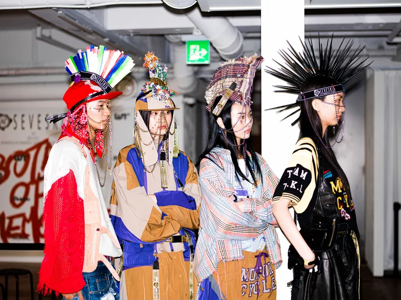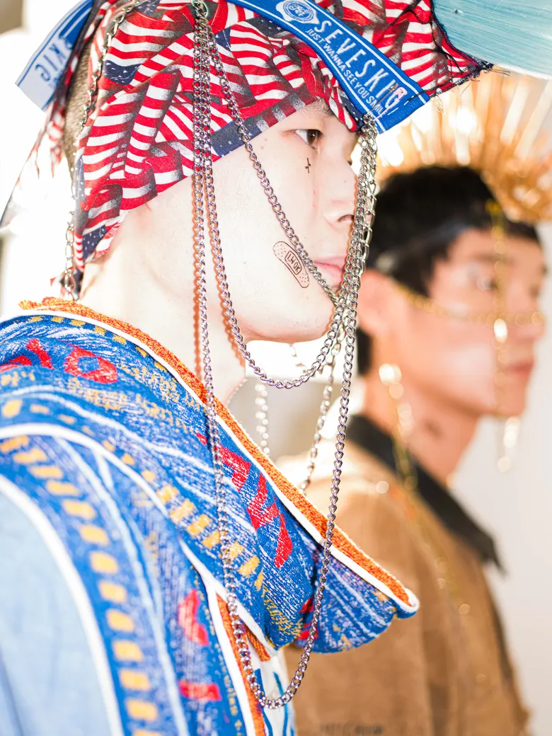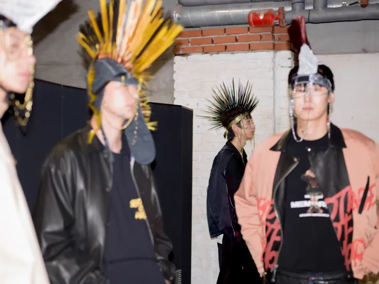 百瀬:ショーの演出として27体のヘッドピースを作成したんですけど、あれをやりたいと言ったのは僕なんです。10代というのはやりたいことだらけなのに何ひとつ叶わなくて、欲求も欲望もパンクな状態です。前回までの「五色人」が大人の雰囲気だったので今回はティーンエイジャーらしさを表現したくて、パンクの象徴として思いついたのがモヒカンでした。
