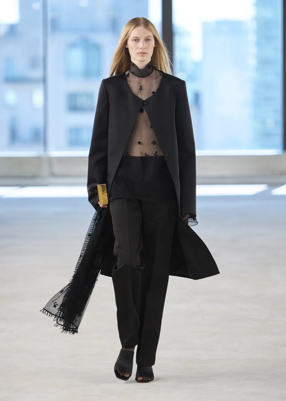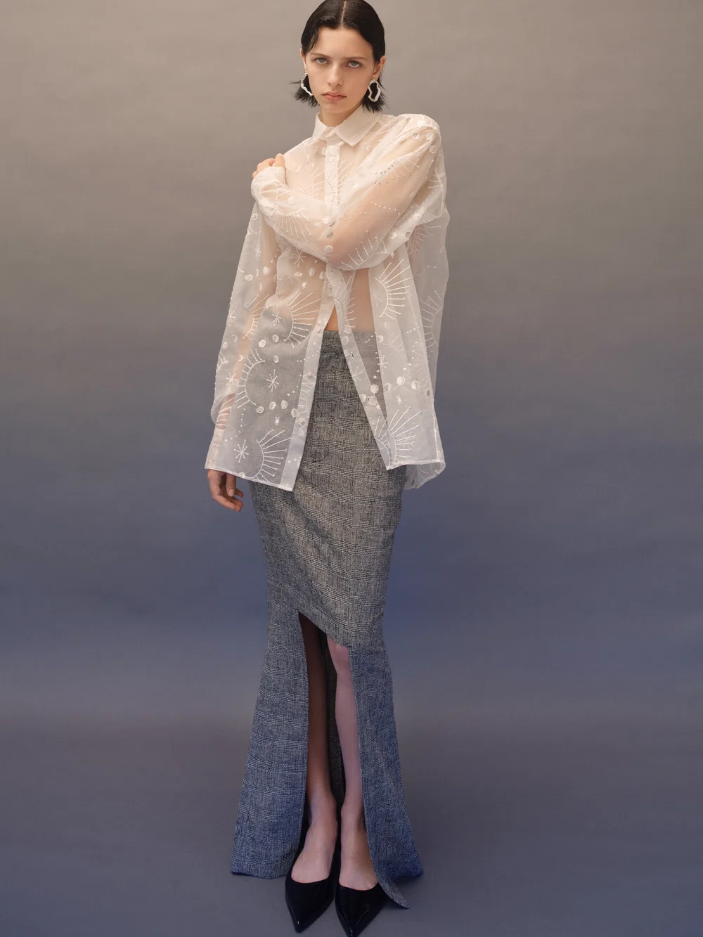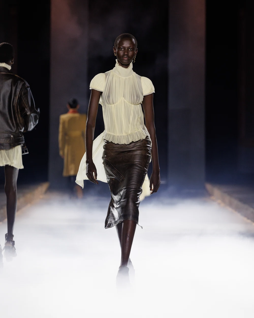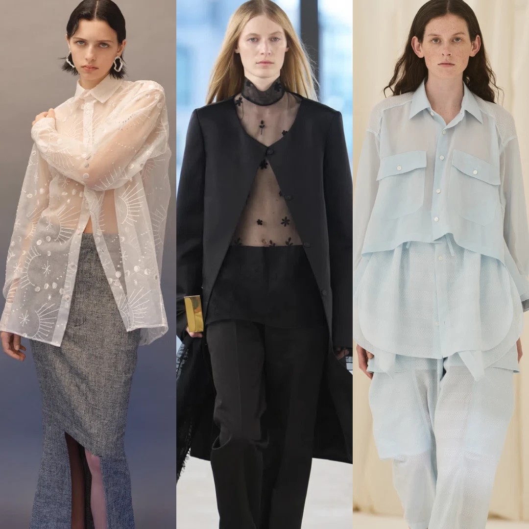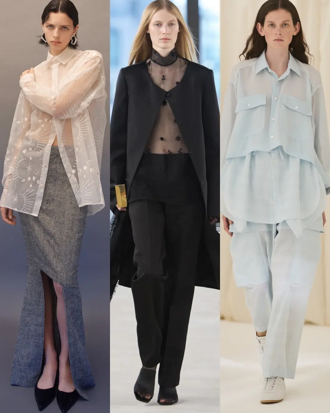 2025年春夏のコレクションでは、シアーブラウスを取り入れたワントーンスタイルが数多く登場。特に印象的だったのは、ホワイトやエクリュといった軽やかなカラーで統一されたルック。透け感と色の一体感が生み出すクリーンさと奥行きは、今季ならではの美しさを放つ。