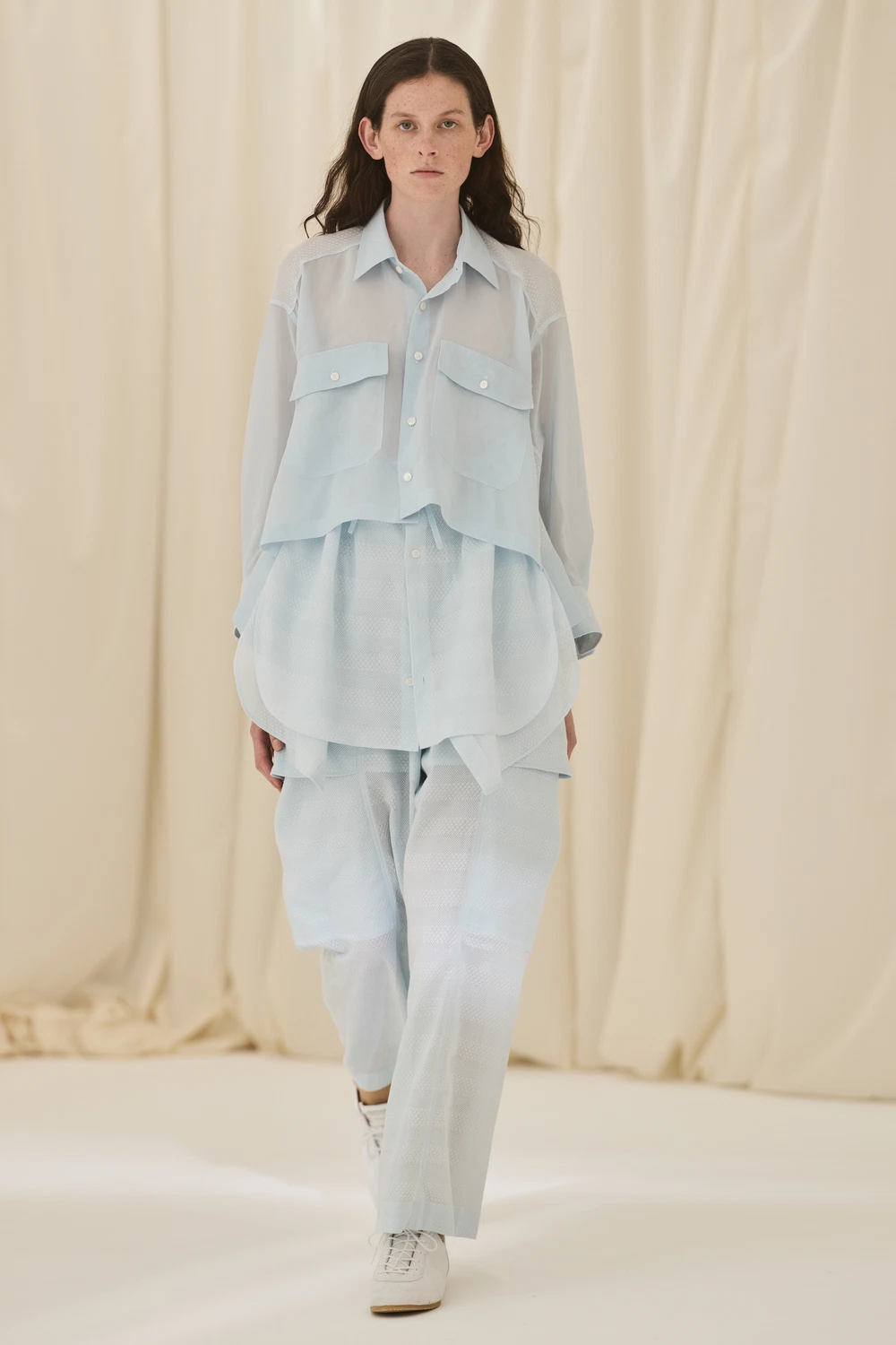 ボトムスにもシアー素材を用いれば、全身に風が通るような涼しげな雰囲気に。一方で、トップスにだけ透け感を仕込み、テーラードジャケットやウールライクな素材と合わせれば、緊張感と柔らかさが交差するモードなスタイルに仕上がる。