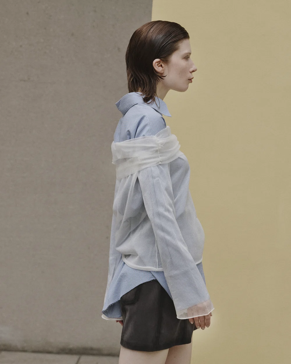 一見トリッキーな合わせでも、シアー素材ならどこか抜け感があり、挑戦しやすいのが魅力。ベーシックなアイテムにほんの少しの“ひねり”を加えたいとき、シアーブラウスは最も頼れる存在になってくれる。
