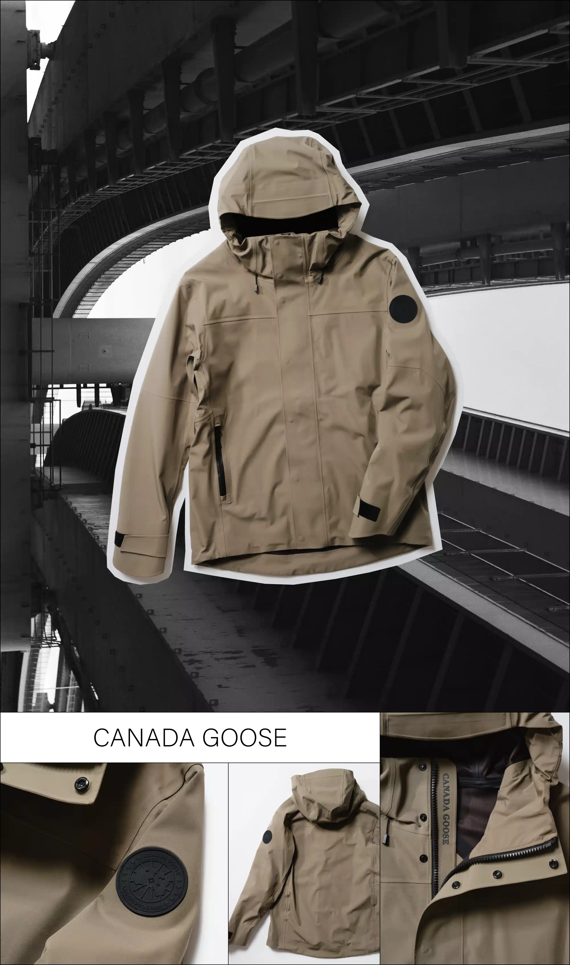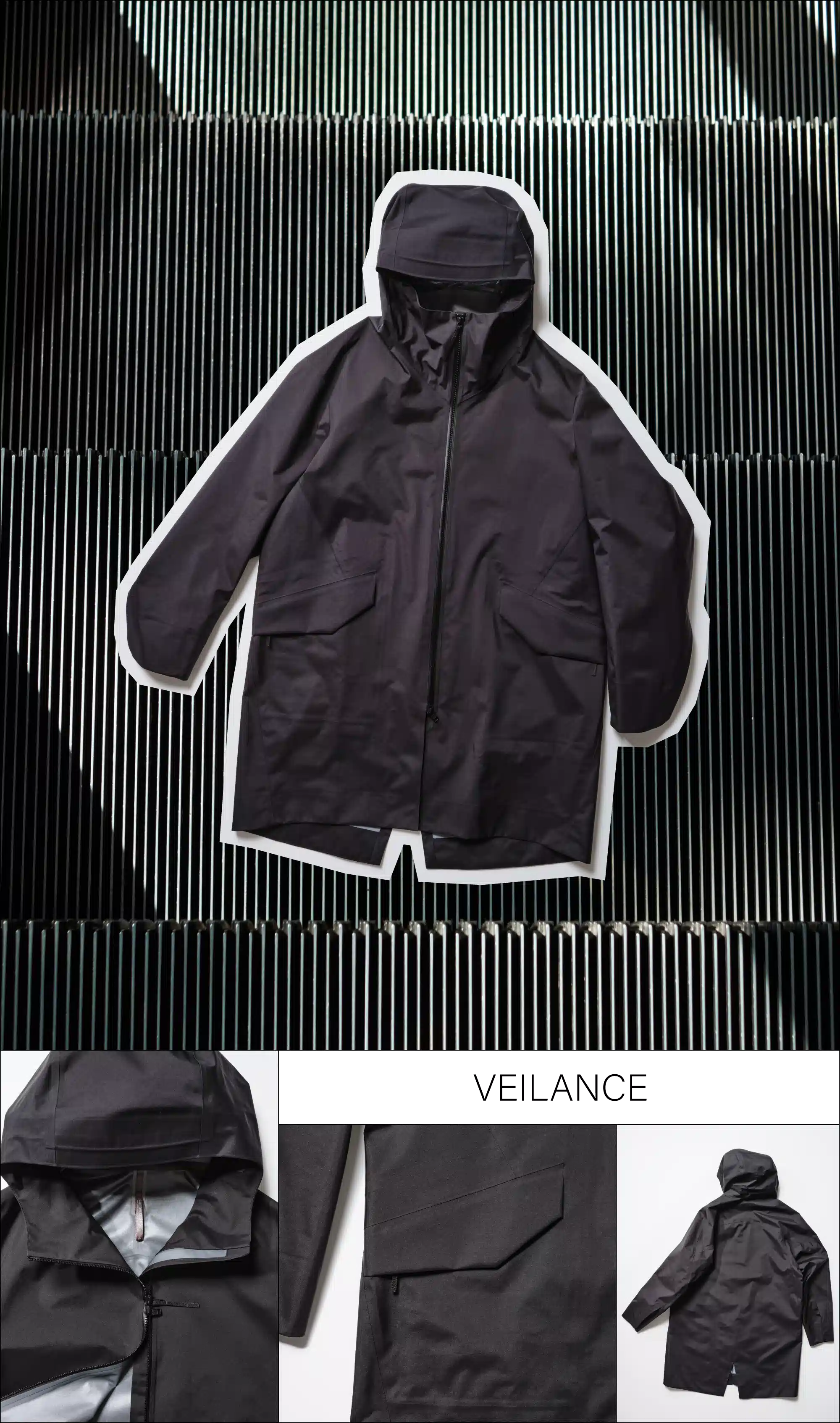 悪天候下でも都市を快適に歩ける機能美の象徴。PFASフリーのGORE-TEX ePEメンブレンを採用し、防水・防風性と透湿性を高次元で両立した。リサイクル素材を用いた環境配慮設計ながら、軽量で静音性にも優れる仕上がり。立体裁断による可動域の広さと、DropHood™やフィッシュテールヘムなどの特徴的なディテールが、ミニマルでモダンな佇まいを完成させている。