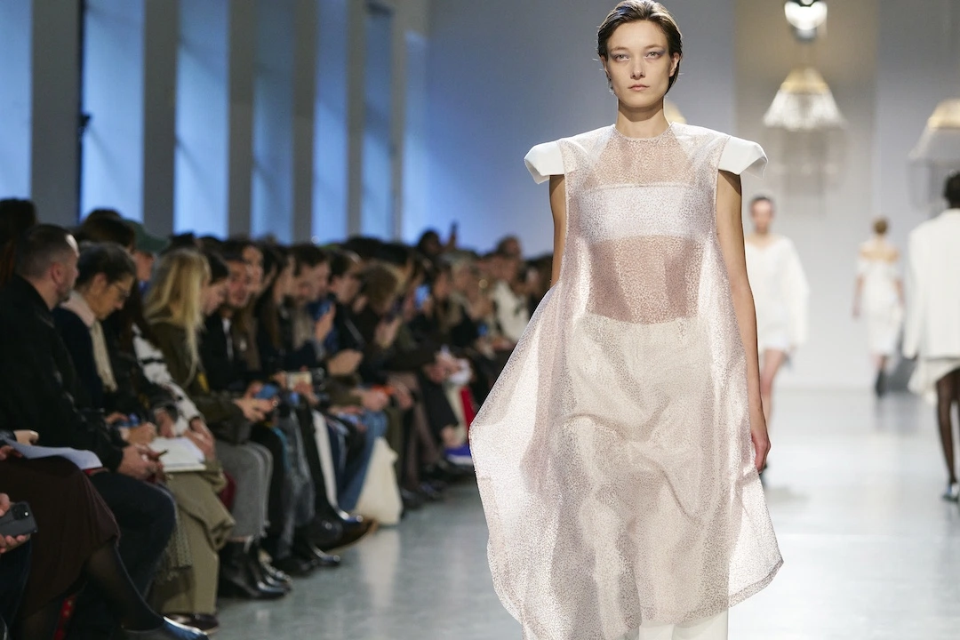 緻密な仕立てと柔らかさのあいだを往還するように、テーラリングの厳密さと身体のしなやかな動きが共存するルックが並んだ。白で幕を開け、黒で締めくくるショー構成の中に、マットとグロッシー、透けるオーガンザと重厚なレザーといった質感の対比が織り込まれ、衣服の表層と内側の緊張感が静かに浮かび上がる。