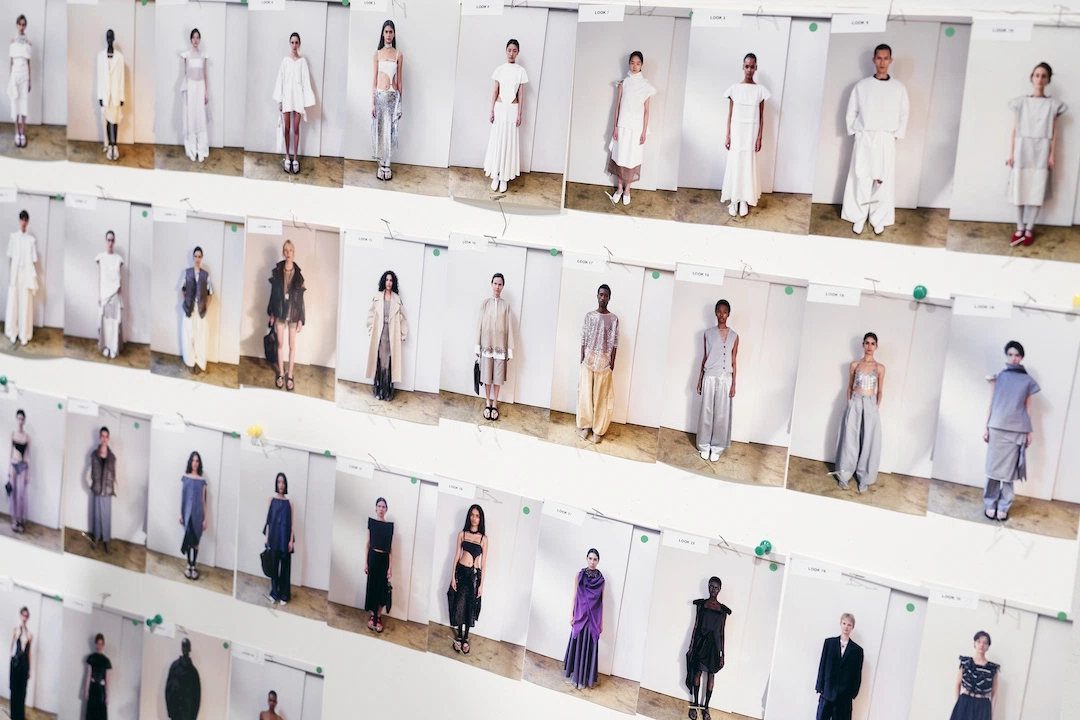 質感のコントラスト、造形的なライン、静寂に宿る存在感が見受けられる。例えば、淡めのグレーやニュートラル、メタリック白銀のアクセント、そして繊細なフリンジやレーザーカットによる花の装飾が今シーズンの世界観を形作っていた。肩や鎖骨を露出するドレスやトップスが、身体の動きに寄り添う曲線的なラインを描き出し、ブランドが得意とする“有機的なフォルム”を際立たせている。一方で、別のアイテムではアシンメトリーなカッティングや、スナップやジッパーによって形を変えるモジュラー構造が用いられ、可変的なデザインが服そのものの構造美を更新していた。