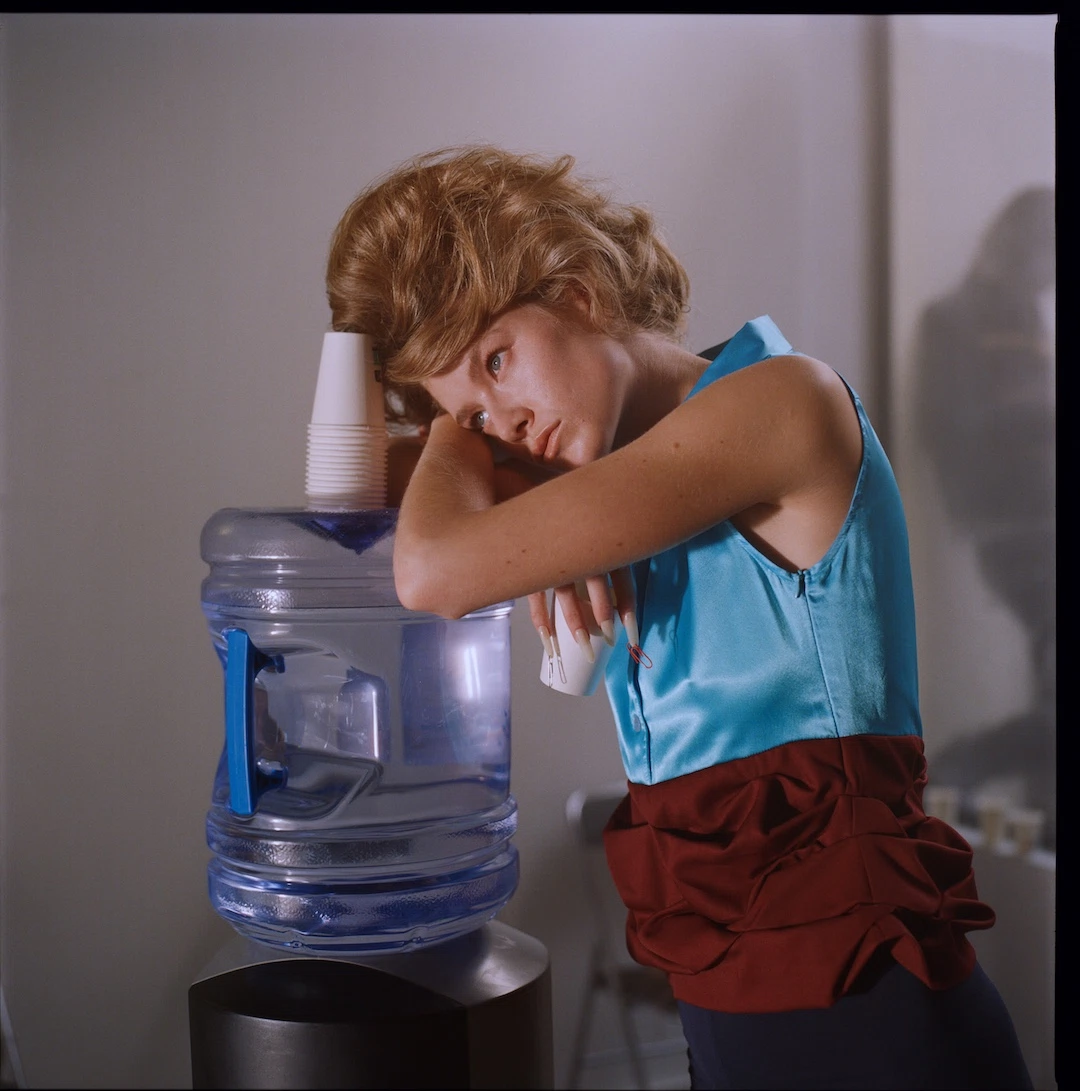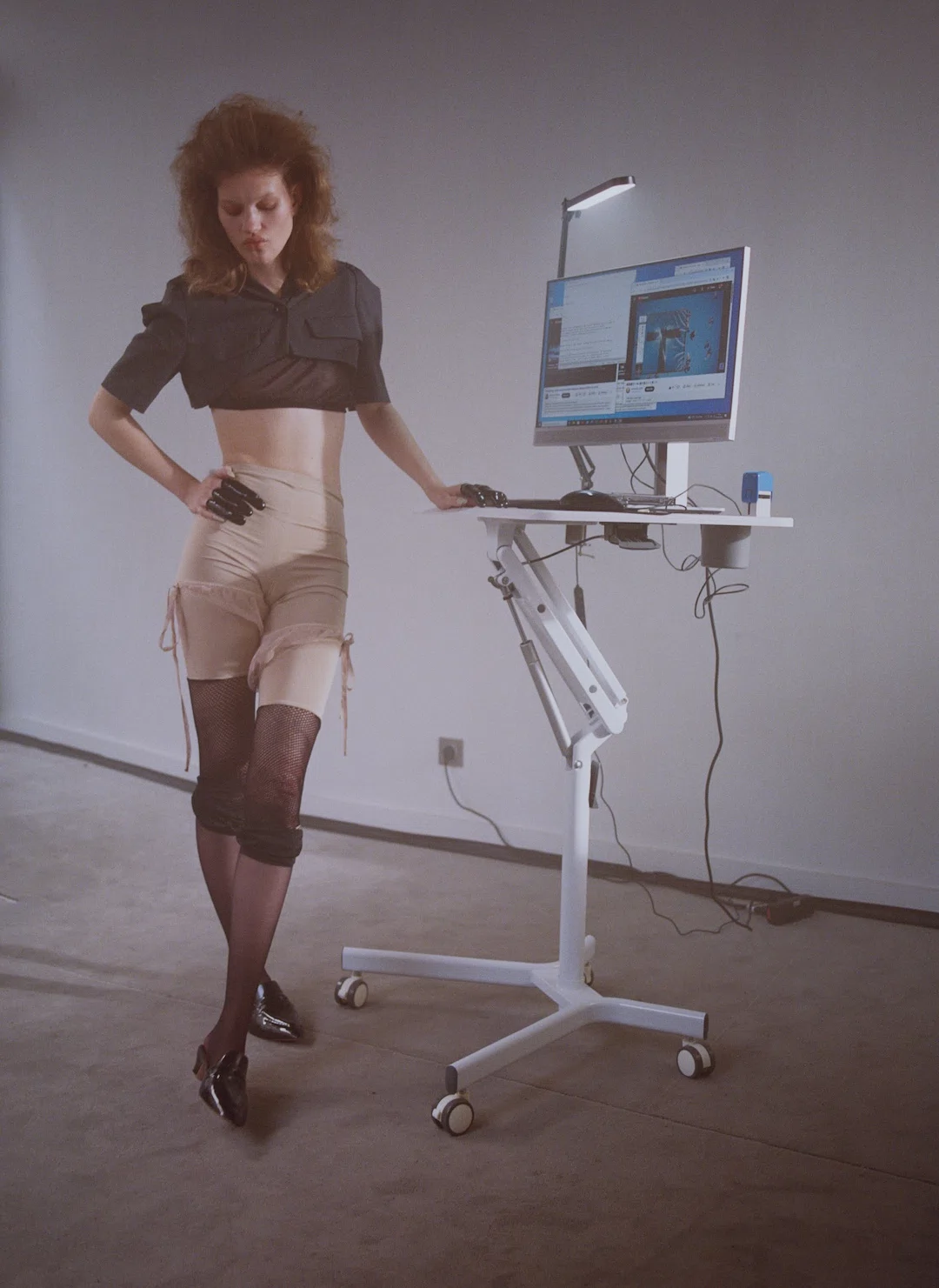 モデルたちはパイプ椅子に座り、PCに向かったり、空想にふけったりといった“日常の一瞬”を切り取るような演出のなかで、現実と空想、規律と自由が交差する空気を描き出した。デザイナーのシュエ・ジェンファンが見つめたのは、繰り返される日々の中にふと訪れる逃避の瞬間。その曖昧な感覚を、ファブリックとシルエットのずれを通して可視化している。