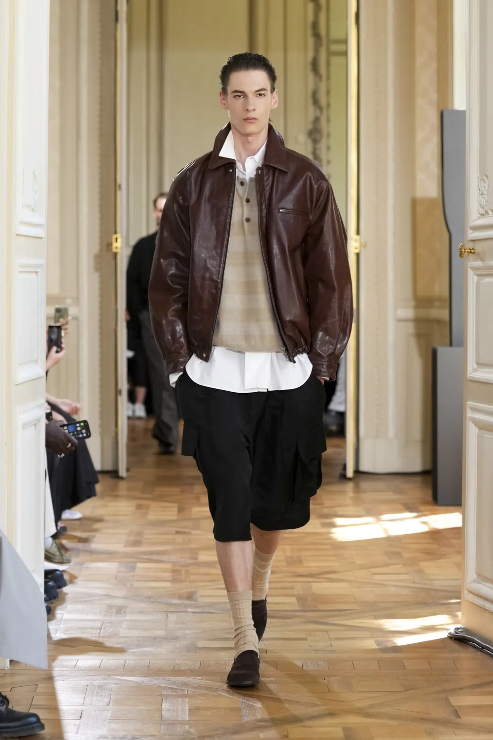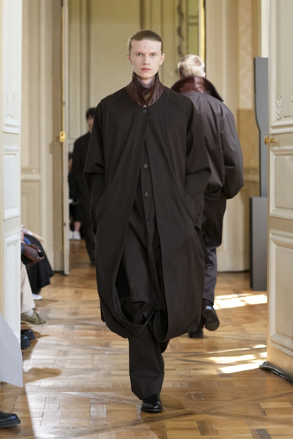 定番アイテムのアップデートからコレクションが立ち上がるという制作スタイルは今季も変わらない。ドッキング構造のコートには新たにステンカラータイプが登場。フライトジャケットは、ウエストにリブを効かせたバージョンと、本体にギャザーを寄せたものの2型を提案した。パンツでは、アーチ型のレッグラインやツイストしたヘムラインなど、新型のパターンも加わっている。浅川はシーズンごとに定番を微細に調整しながら“今の気分”を服ににじませていく。ステッチの幅をミリ単位で変える、ポケットの配置をずらす。そういった地道な作業の果てに、意識下のムードが輪郭を持ち、次第に新作として立ち上がってくる。そこにあるのは派手なストーリーはなく感覚と技術だ。
