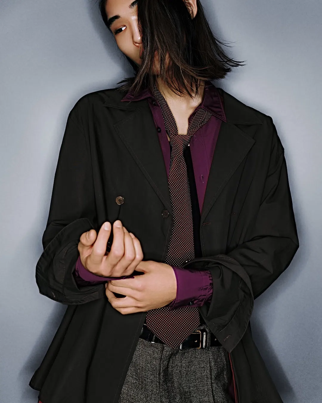 一見、ハードルが高そうなタイドアップスタイルも、少しだけ力を抜いた着こなしで、ぐっとモダンに。ネクタイはきっちり締めすぎず、ふわりとラフに巻くのが今の気分。襟元も少し崩して、抜け感を演出。色味は統一しつつも、シルエットや素材でカジュアルダウンしすぎないよう調整を。トラッドとリラックスが共存するスタイルは、肩肘張らない知的なムードを漂わせる。
