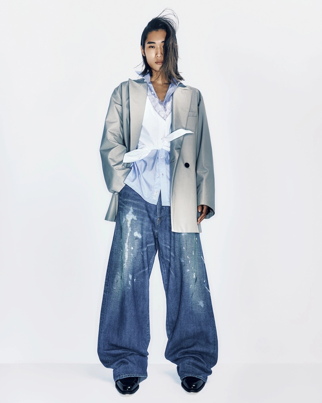 ペイントが施されたデニムに、レースのディテールが光るシャツをレイヤード。そこに淡いトーンのテーラードジャケットを合わせれば、ラフさとフォーマルの狭間を軽やかに漂う新感覚スタイルが完成する。ポイントは、シャツの裾をゆるく結んでアクセントにすること。さらに、足元には光沢のあるレザーシューズを選び、全体のバランスをきゅっと引き締める。フォーマルの格式に、あえての“遊び”を効かせて。