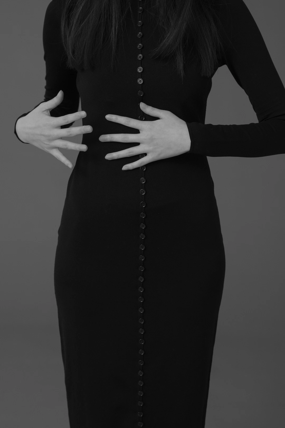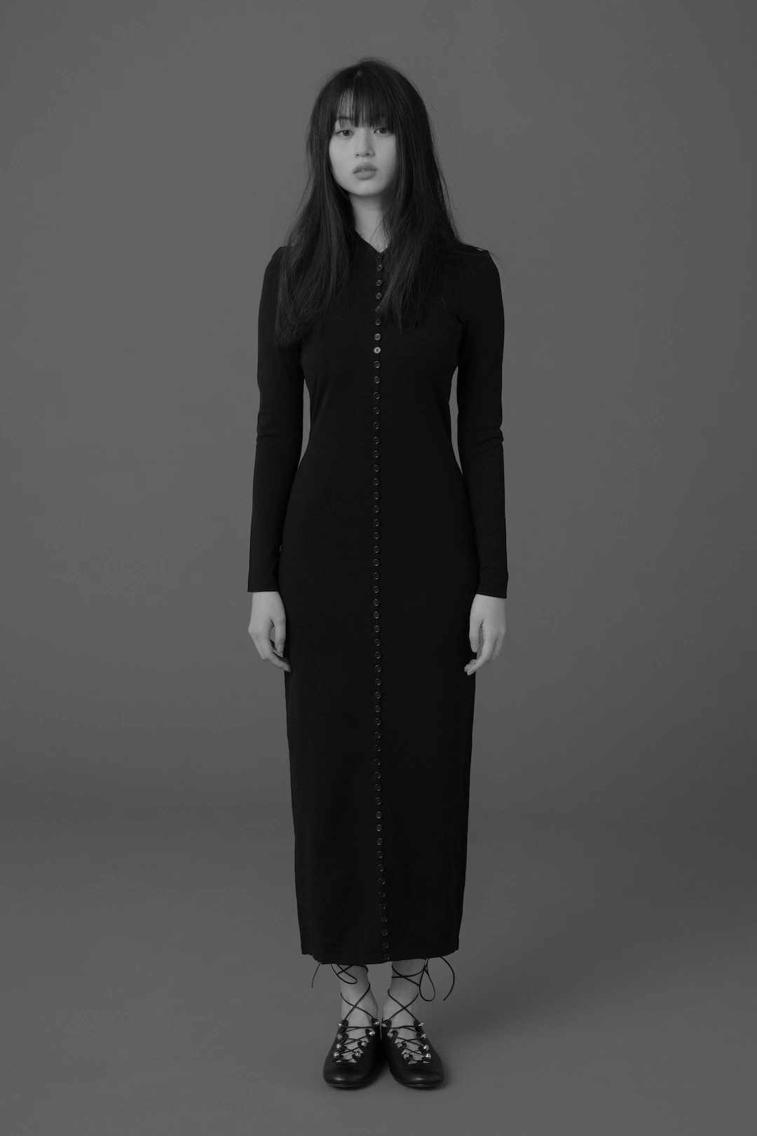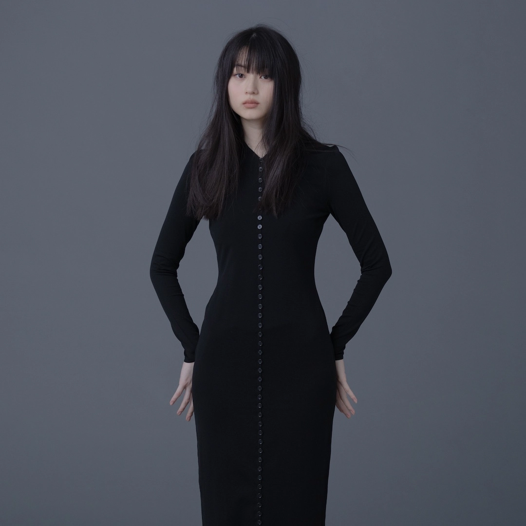 構築的なドレスに縦のラインで連なるボタン。