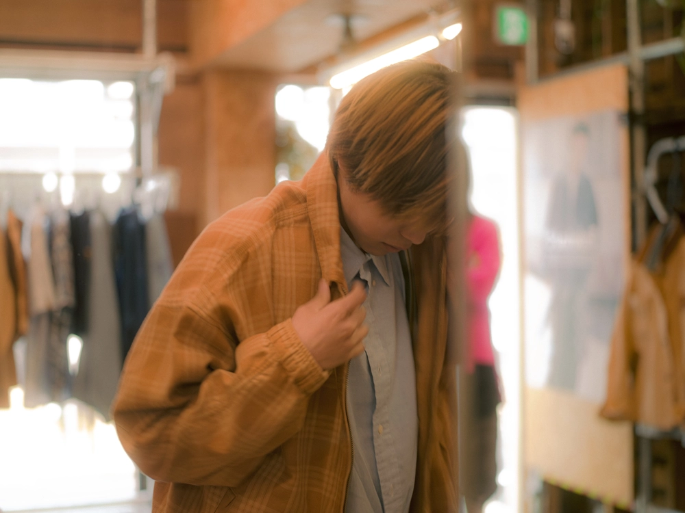 木村:ストラザム ボマー プレイド ジャケットです。普段は暗めのトーンの服が多いんですが、ダークトーンのブルーに加えて、裏地のオレンジや襟裏のレザーのディテールが効いていて、スタイリングのアクセントになるところに惹かれました。