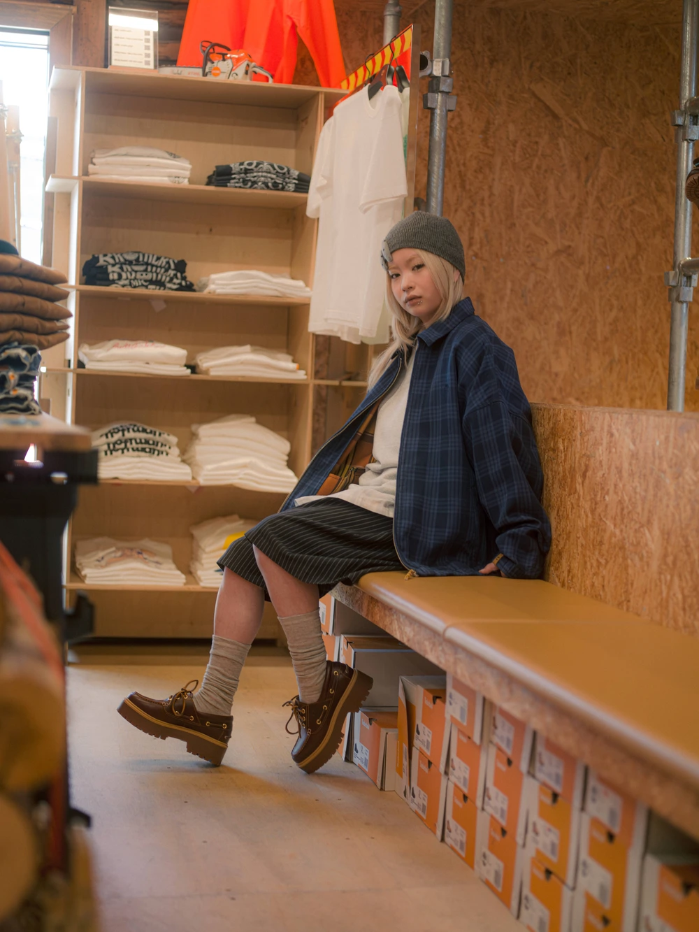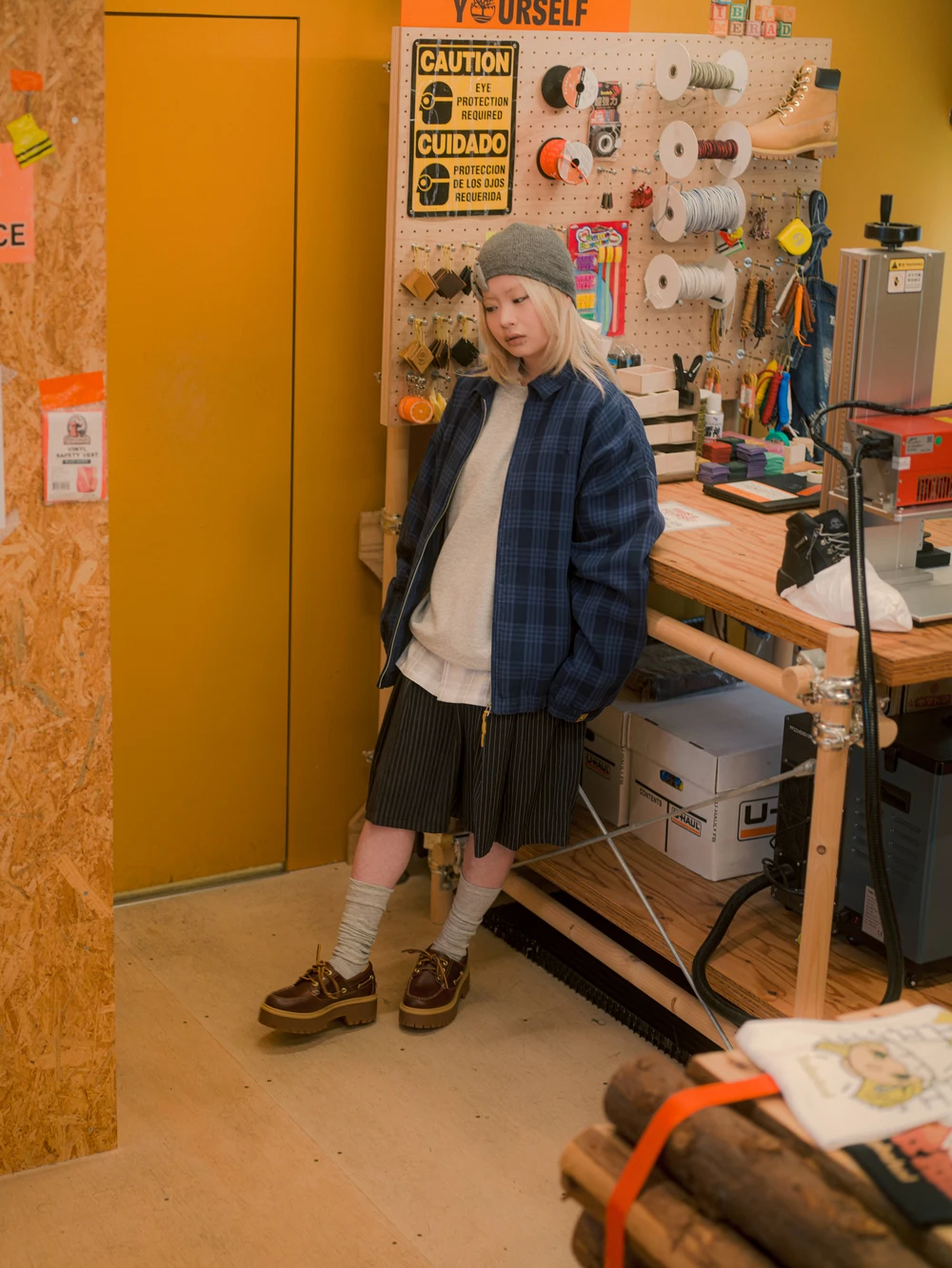 木村:ブルーのチェックのアウターが印象的だったので、それを軸にスタイリングを組みました。アウターの雰囲気に合わせて全体のバランスを整えつつ、SSのアイテムということもあってレイヤードで明るいトーンを取り入れています。ワークやアウトドアの要素も感じさせながら、自分のスタイルに馴染むように意識しました。
