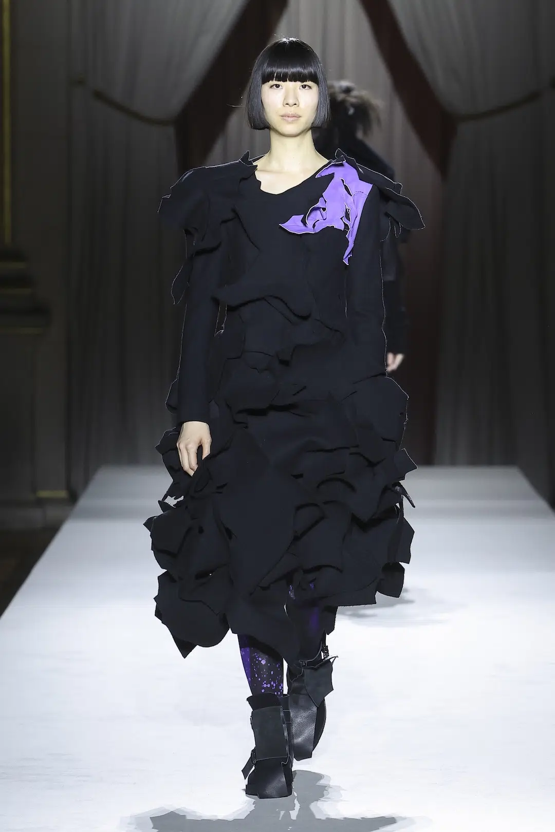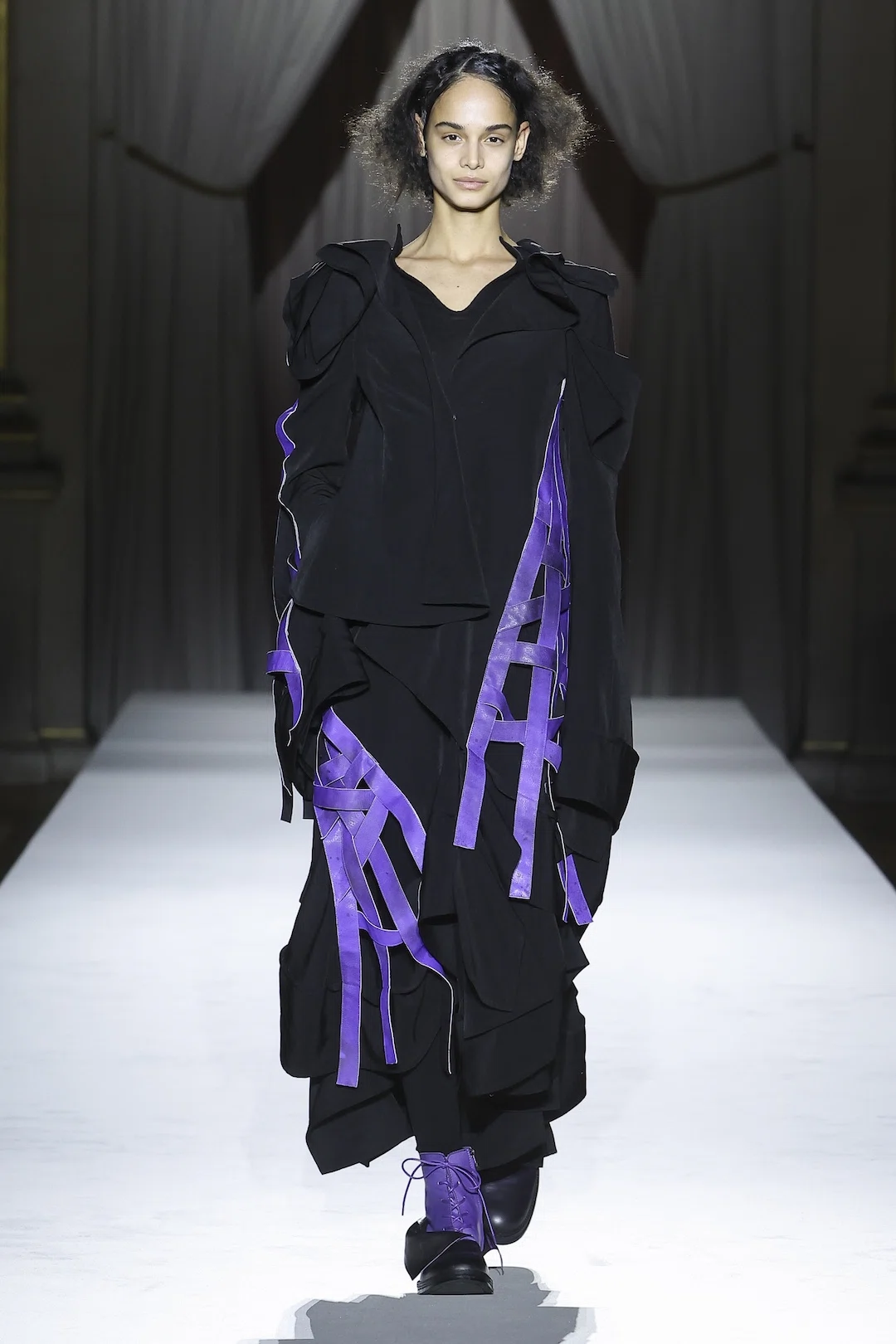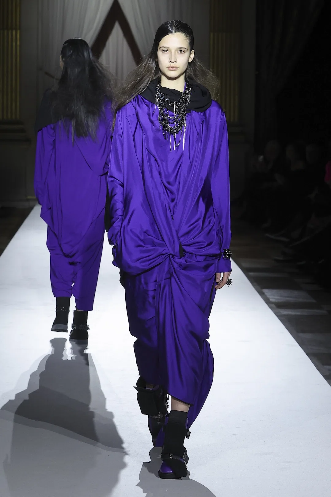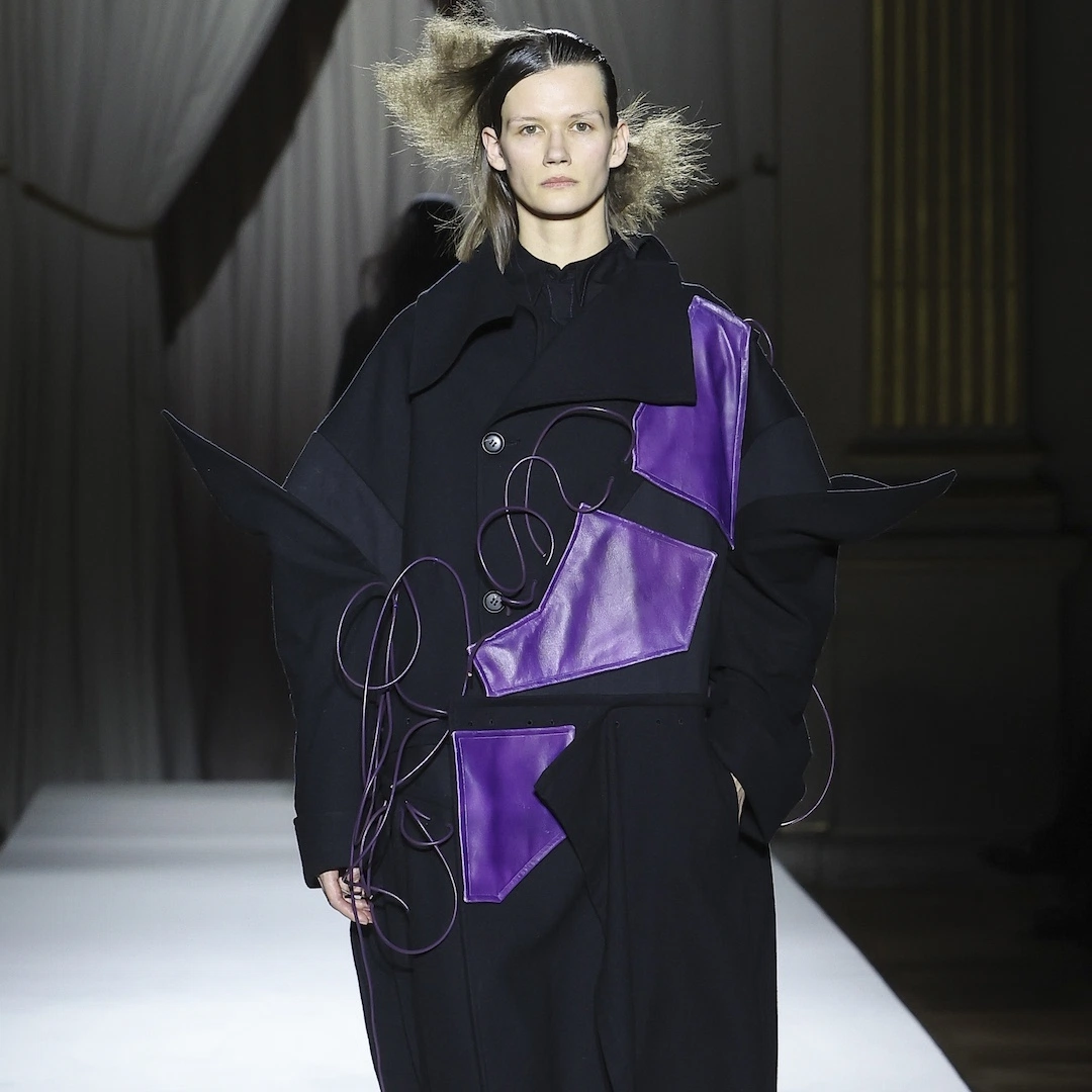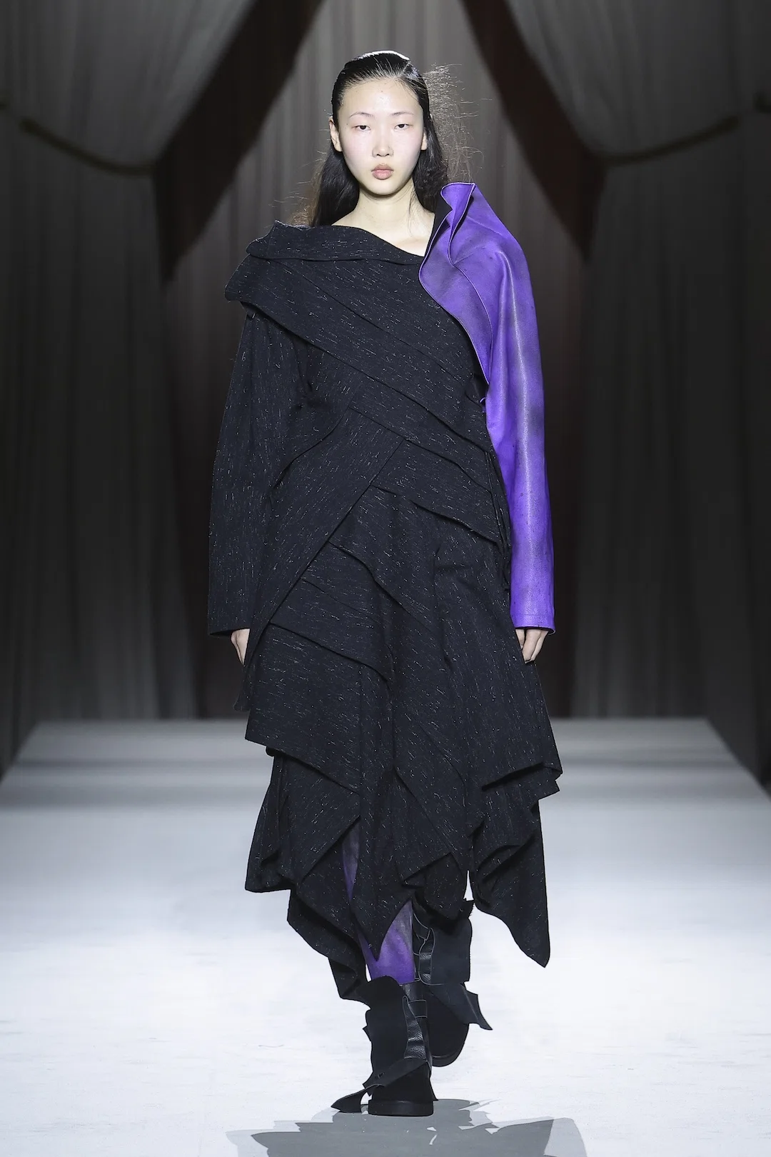今シーズンのキーカラーはパープル。赤(情熱や愛)と青(冷静や理性)が交わることで生まれるこの色は、愛と憎しみという相反する感情の交錯を象徴するように映る。まるで相反する感情が同時に存在し、その微妙なバランスが揺れ動くような繊細な心理描写が、コレクション全体に漂っていた。