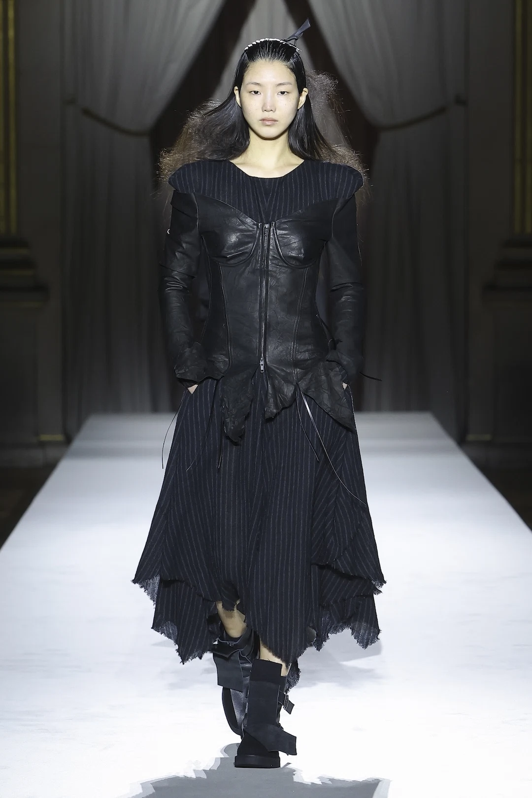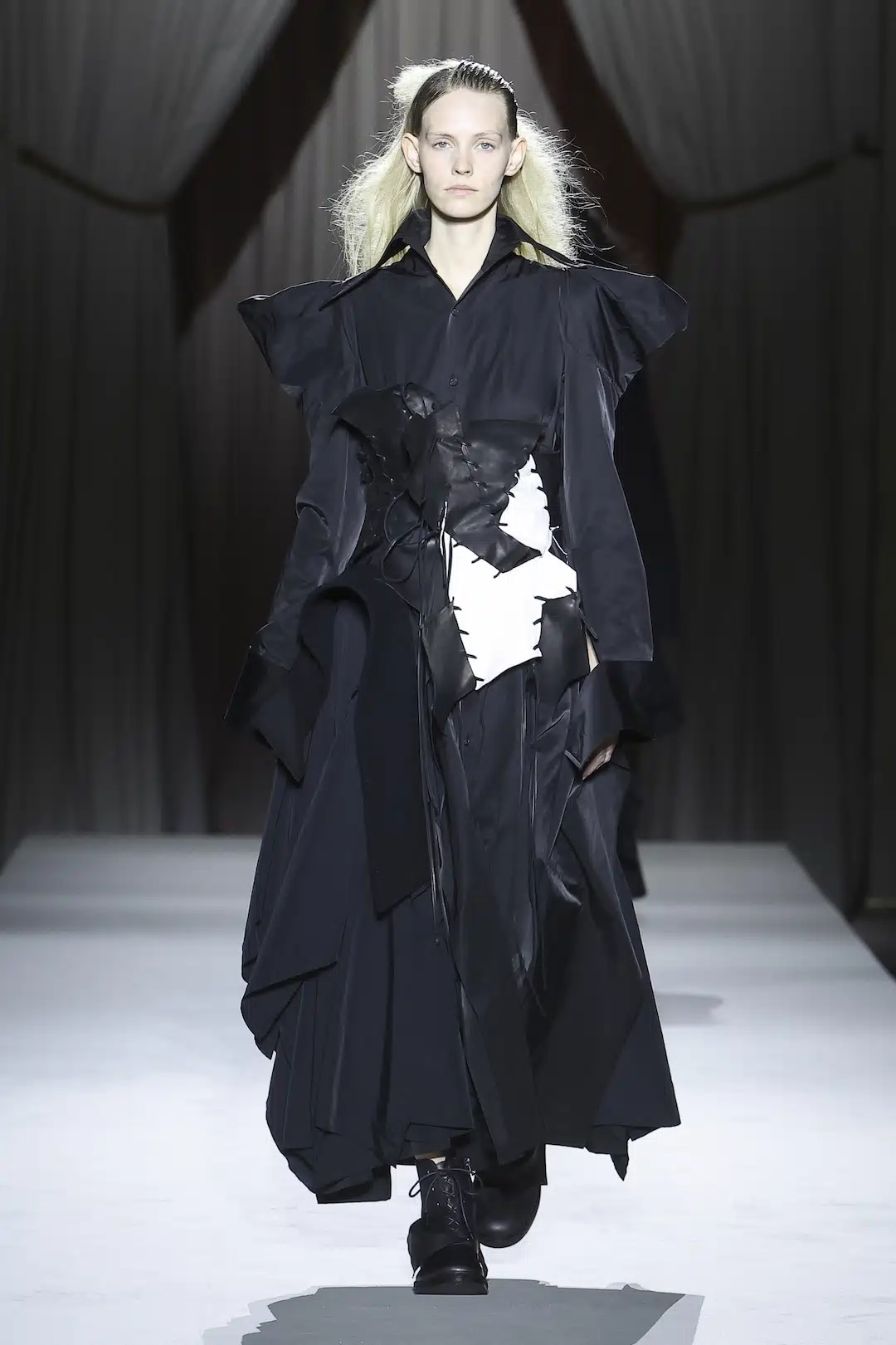 序盤のルックでは、口元まで覆うハイネックの衣装を纏ったモデルが登場。顔の下半分を隠すことで、過去の傷や言葉にできない思いを象徴しているかのようだった。