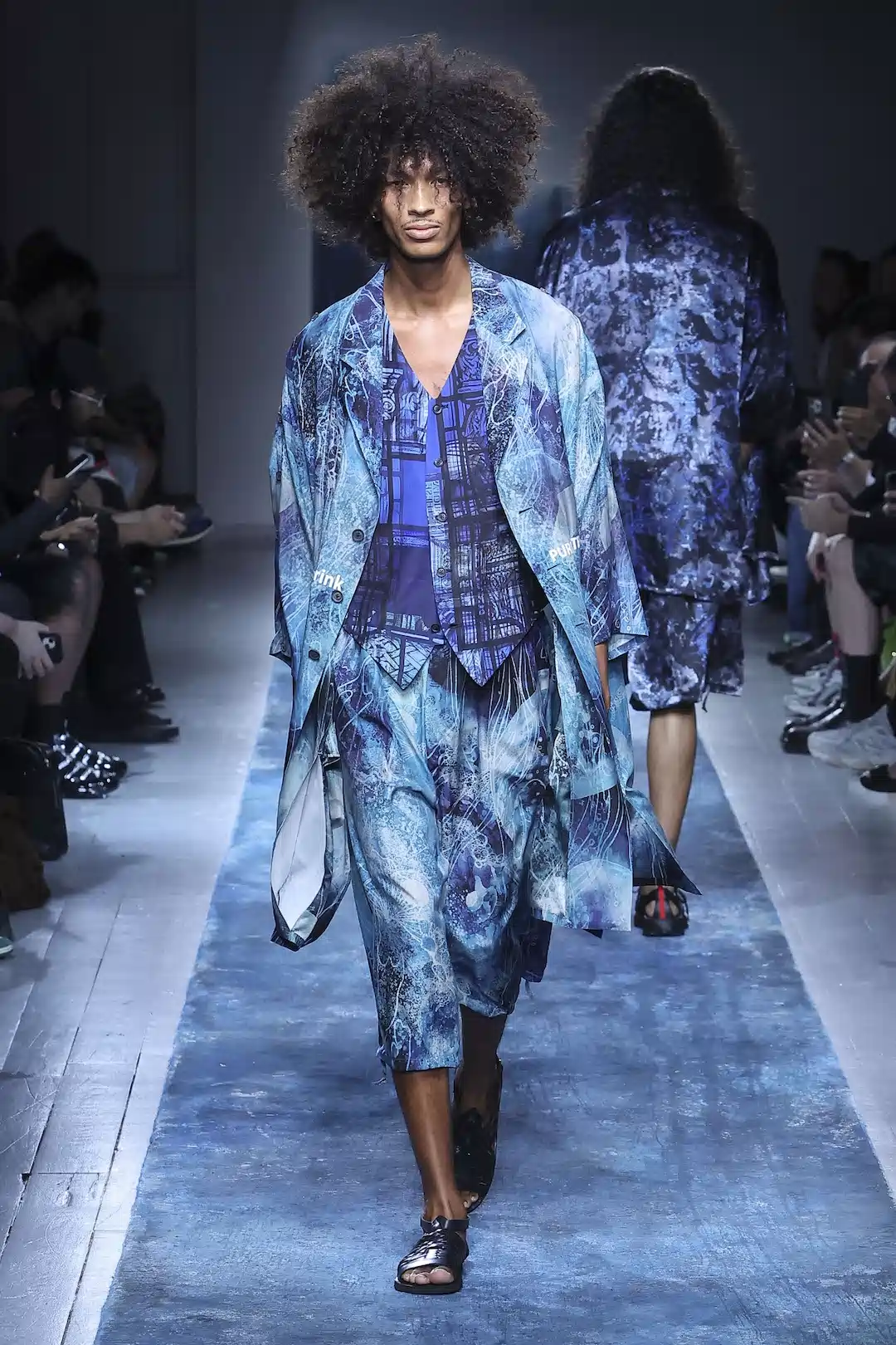 ショーは、白地に墨を流したような黒のラインが走るシャツに、ゆったりとした黒の半袖ジャケットを合わせたルックで始まった。動くたびに揺れるパンツが、衣服の儚さとしなやかな存在感を象徴している。