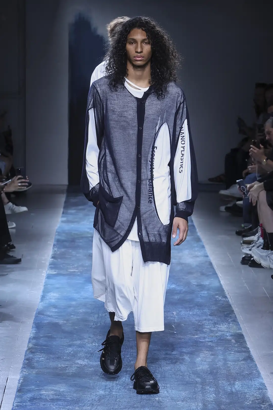 「OCEAN DISAPPEARS MAKES HUMANS FINISHED(海が消えれば人類は終わる)」「MICROPLASTICS」「NUCLEAR POWER DISASTERS」といった言葉が、衣服の上に浮かび上がる。透け感のある素材やドローコードが用いられたルックには、壊れやすい世界への感受性が繊細に表現されていた。濃淡のブルーで構成されたレイヤードは、深海の静けさや水面の揺らぎを思わせる演出となっていた。