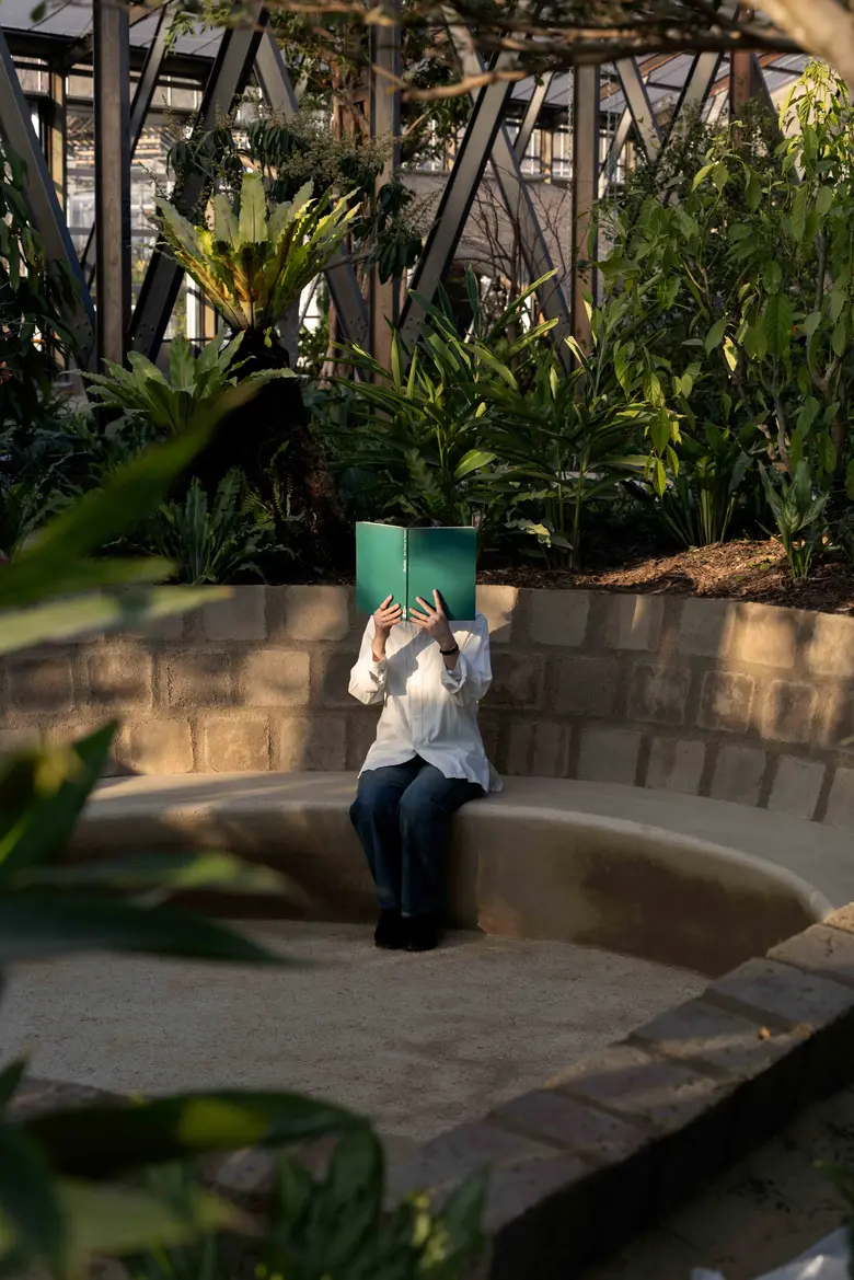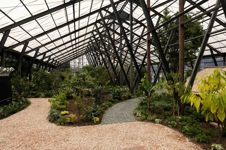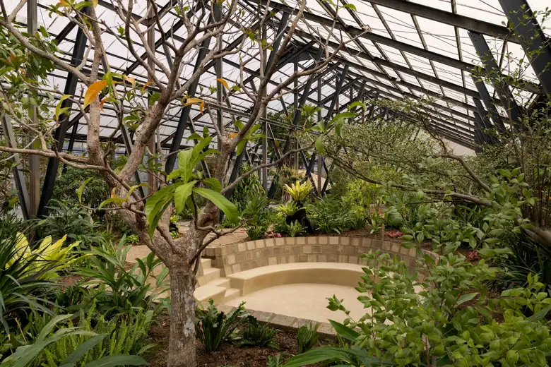 温室空間「GREEN HOUSE」は、展示にとどまらない。常緑で有用性のあるアジアの植物を中心に構成し、年中滞在できる“リビング”として設計されている。