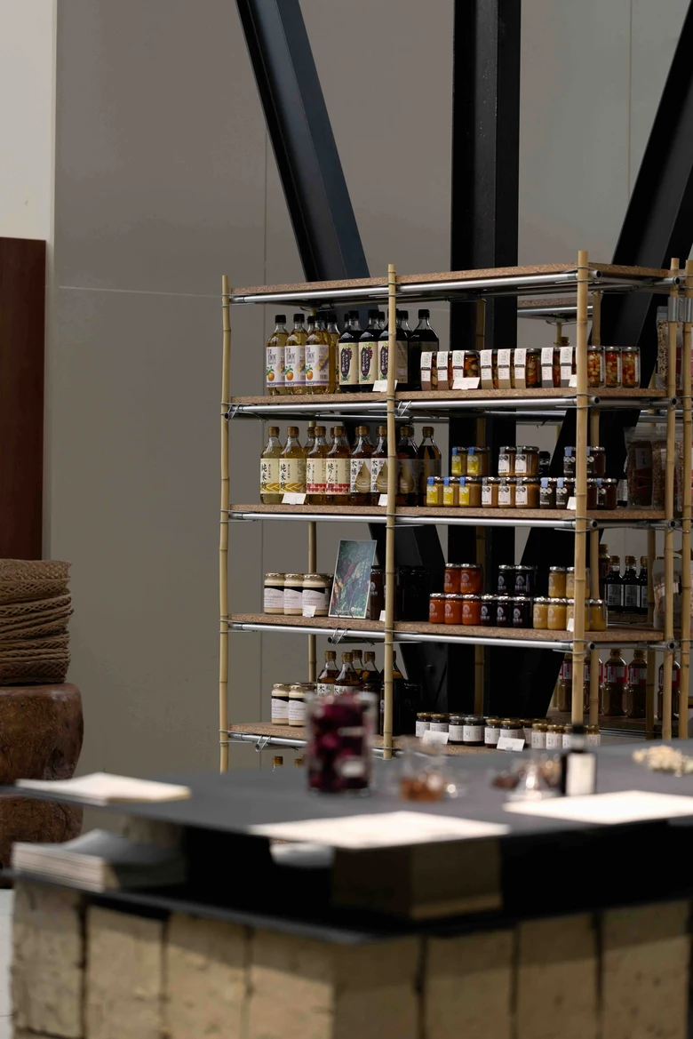 ショップは「裾分けの縁台」をコンセプトに、施設での体験を暮らしへと持ち帰るための場として設計されている。有用植物の苗やフレッシュハーブに加え、焼菓子やブレンドスパイス、ジャムなどのオリジナルグロサリーを展開。さらに家具やアートピースも揃え、植物を“育てる”“使う”“飾る”といった多面的な関わり方を提示する。
