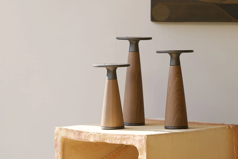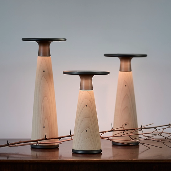 「Vosco」は、メープル/ウォルナットの2種、サイズはS・M・Lの3展開。光源はLEDで、色温度は1700〜2400K。調光は4段階で、LOWでは最長180時間の連続点灯が可能だ。