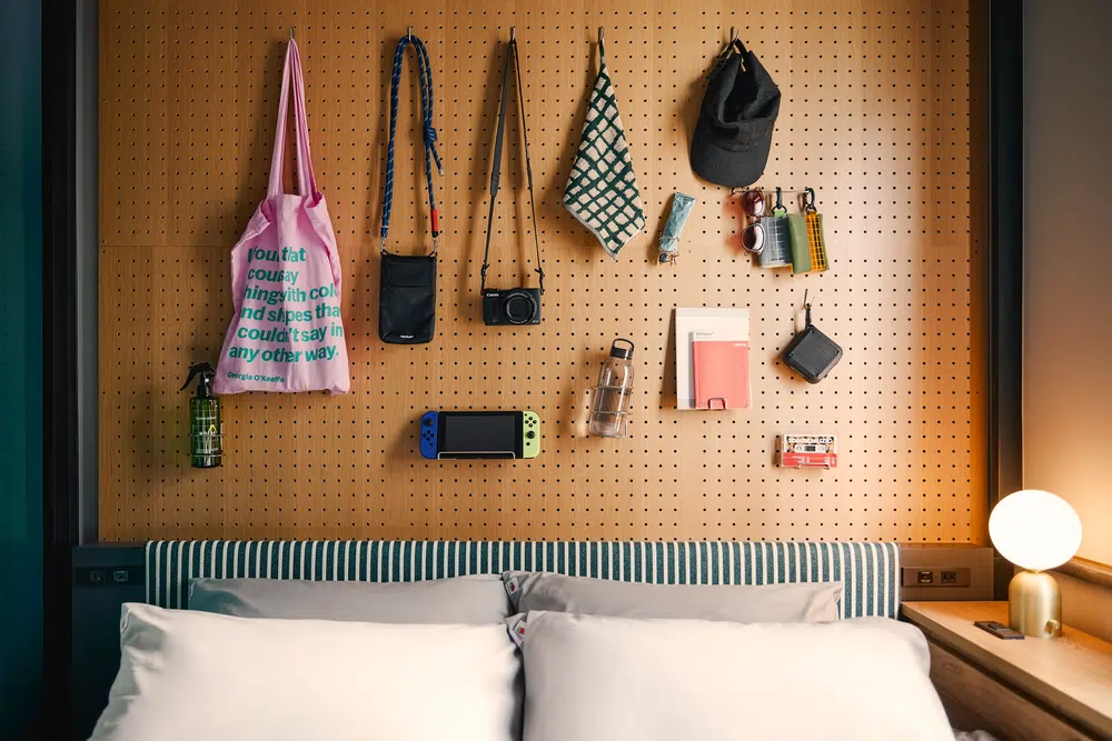 驚くべきは、こうした設備だけでなく、空間全体から感じられる洗練されたバイブス。<cado(カドー)>の空気清浄機、世界初<FRUIT OF THE LOOM(フルーツ オブ ザ ルーム)>のリネンや館内着、<athletia(アスレティア)>のアメニティ(※クイーン・キング以上から)が用意されています。壁にはまるで自分専用かのような有孔ボードがあり、短い滞在の中でも自分らしく部屋をカスタマイズできる楽しさも備わっていました。