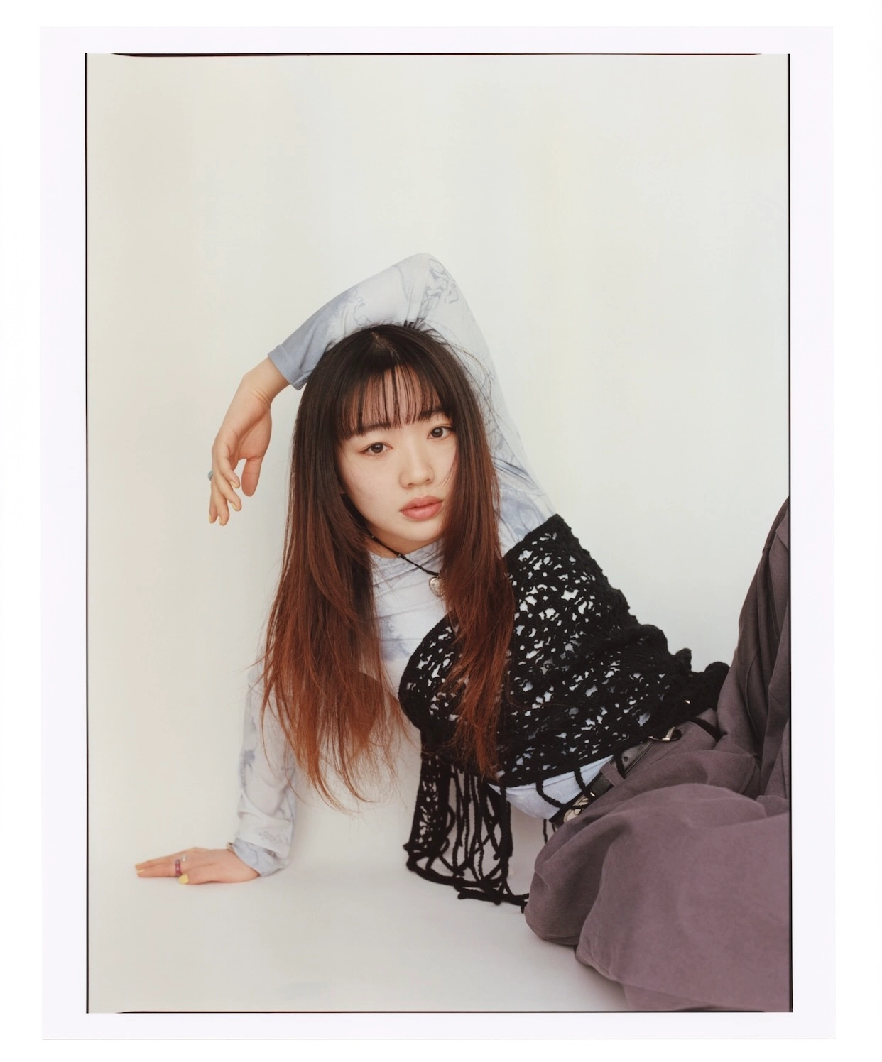 tops ¥10,900 / MELLOW , fringe scarf ¥10,627 / MILLO WOMEN , pants ¥33,440 / ETHOS , necklace ¥6,517・ring(left middle finger) ¥4,510・ring(right index finger) ¥4,270 / NFF ring(right middle finger) ¥12,540・ring(left index finger) ¥12,430・bangle ¥26,950 / MUSEE.ART , shoes ¥27,940 / UDIRE