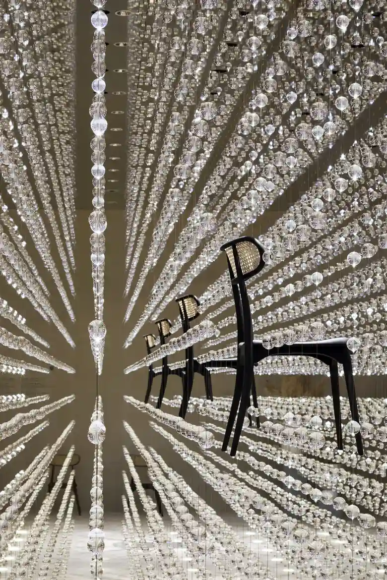今回のインスタレーションの「テーマに掲げたのは点描画を意味する「Pointillisme」。約1万個もの透明な球体をミラー張りの天井から吊り下げ、空間全体を使い光によって立体で表現するインスタレーションを発表した。等間隔に並んだ直径5cmの球体群は光を乱反射し、見る角度によって様々な表情を見せる。さらに、球体によるいくつもの規則的な列の交差によって、視線は奥行きを持つ放射状の直線へと導かれていく。人の視線が直線に伸びていくことで、その先にあるチェアに視点が集中し、より美しい有機的なフォルムを際立たせる。