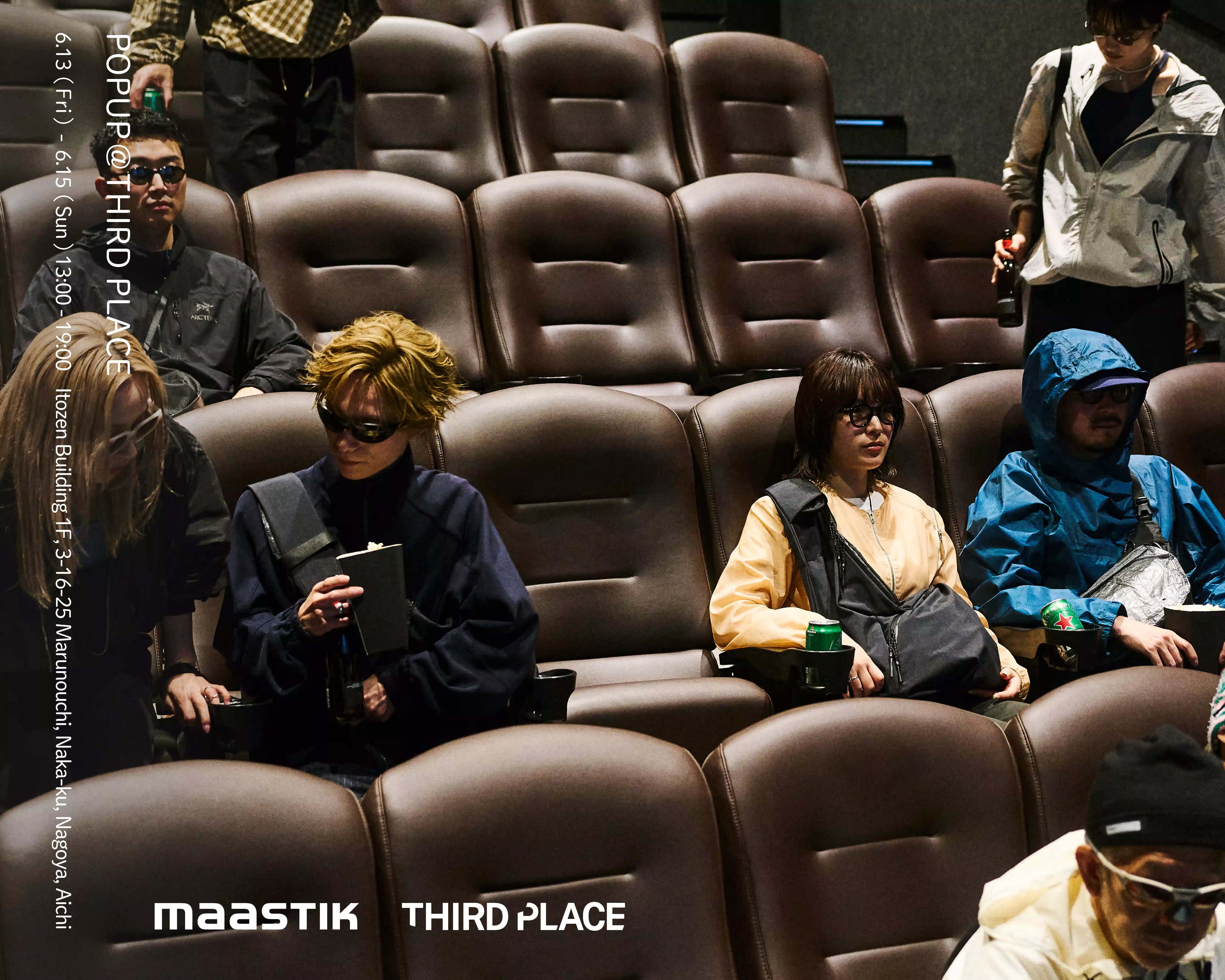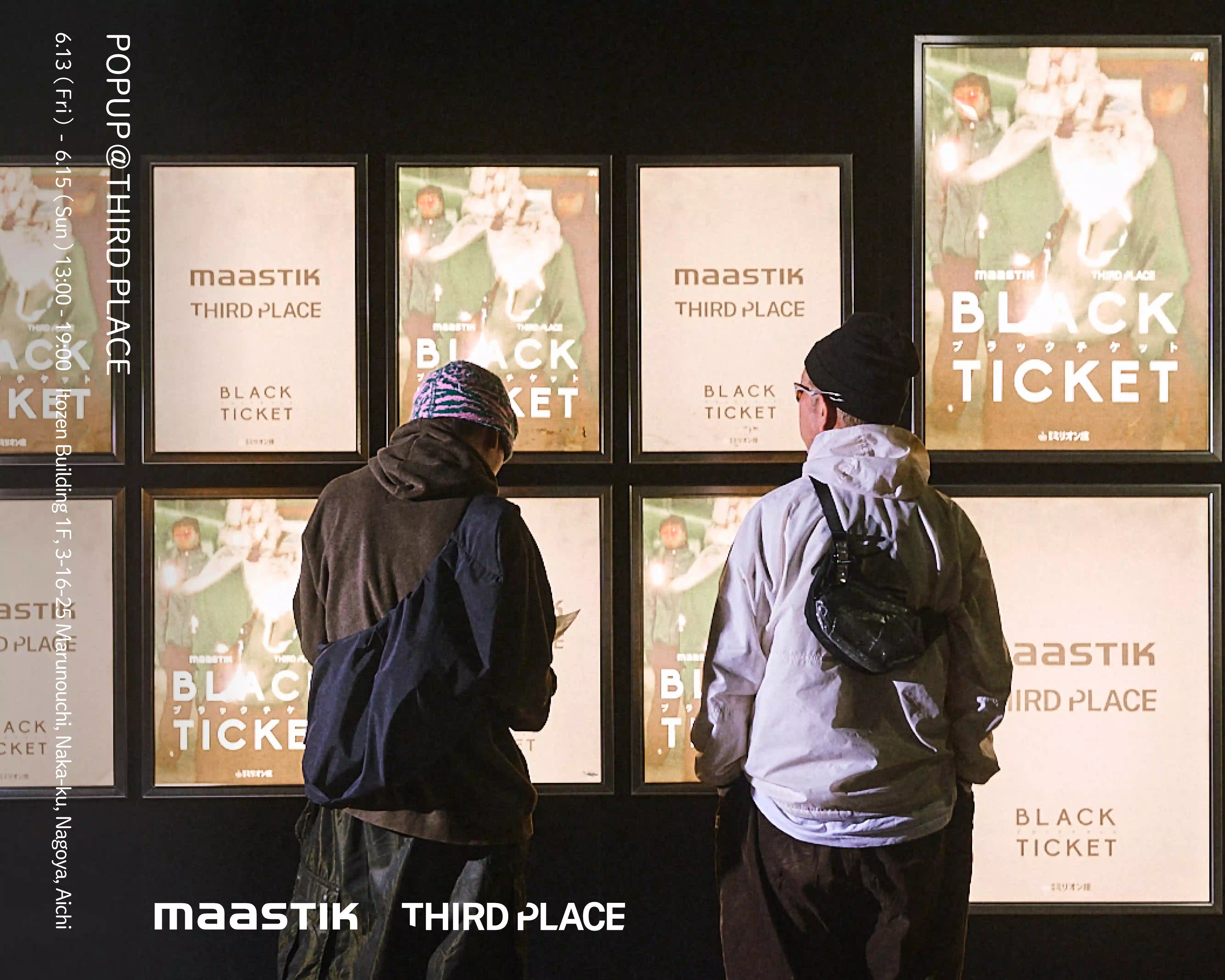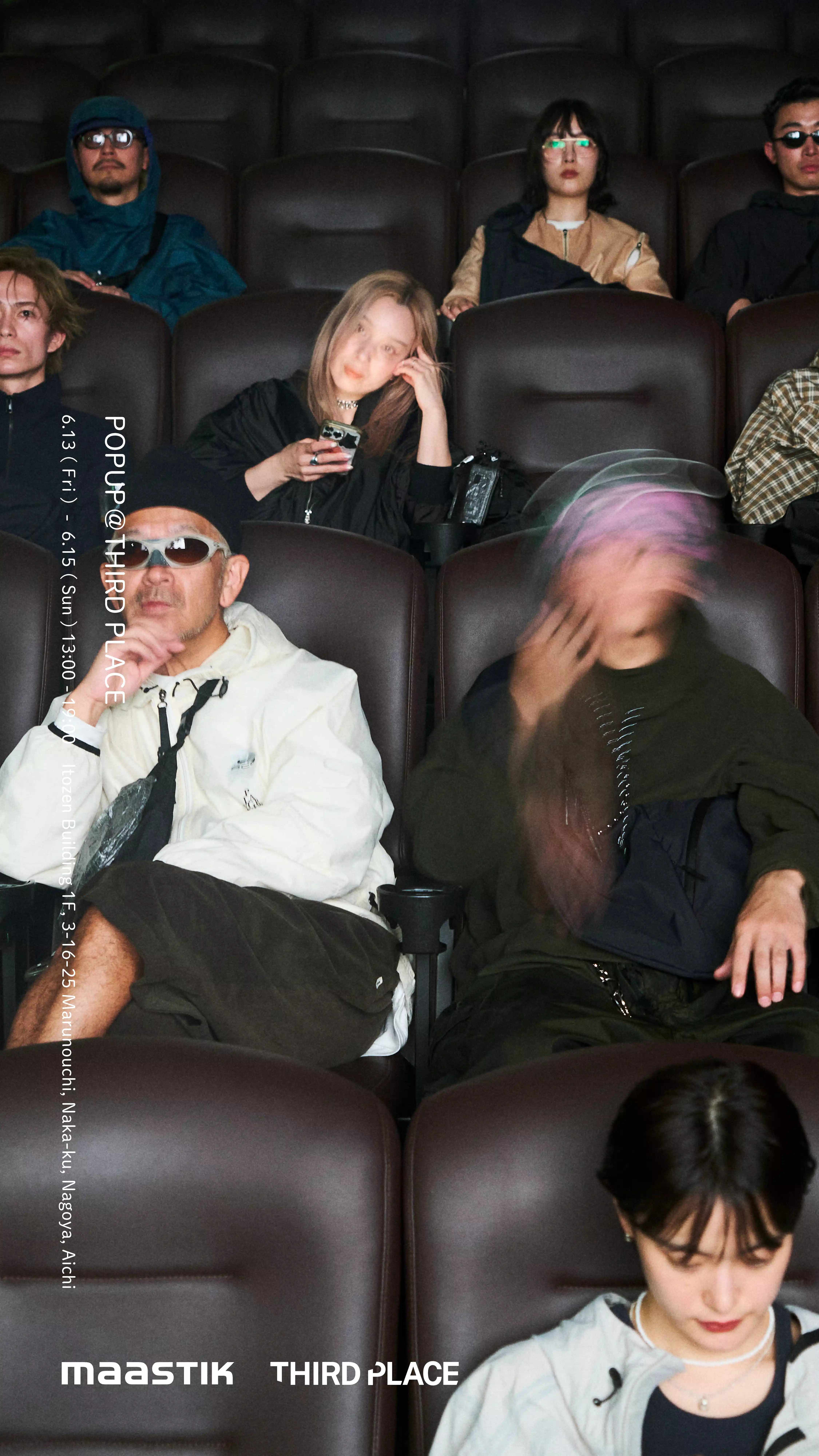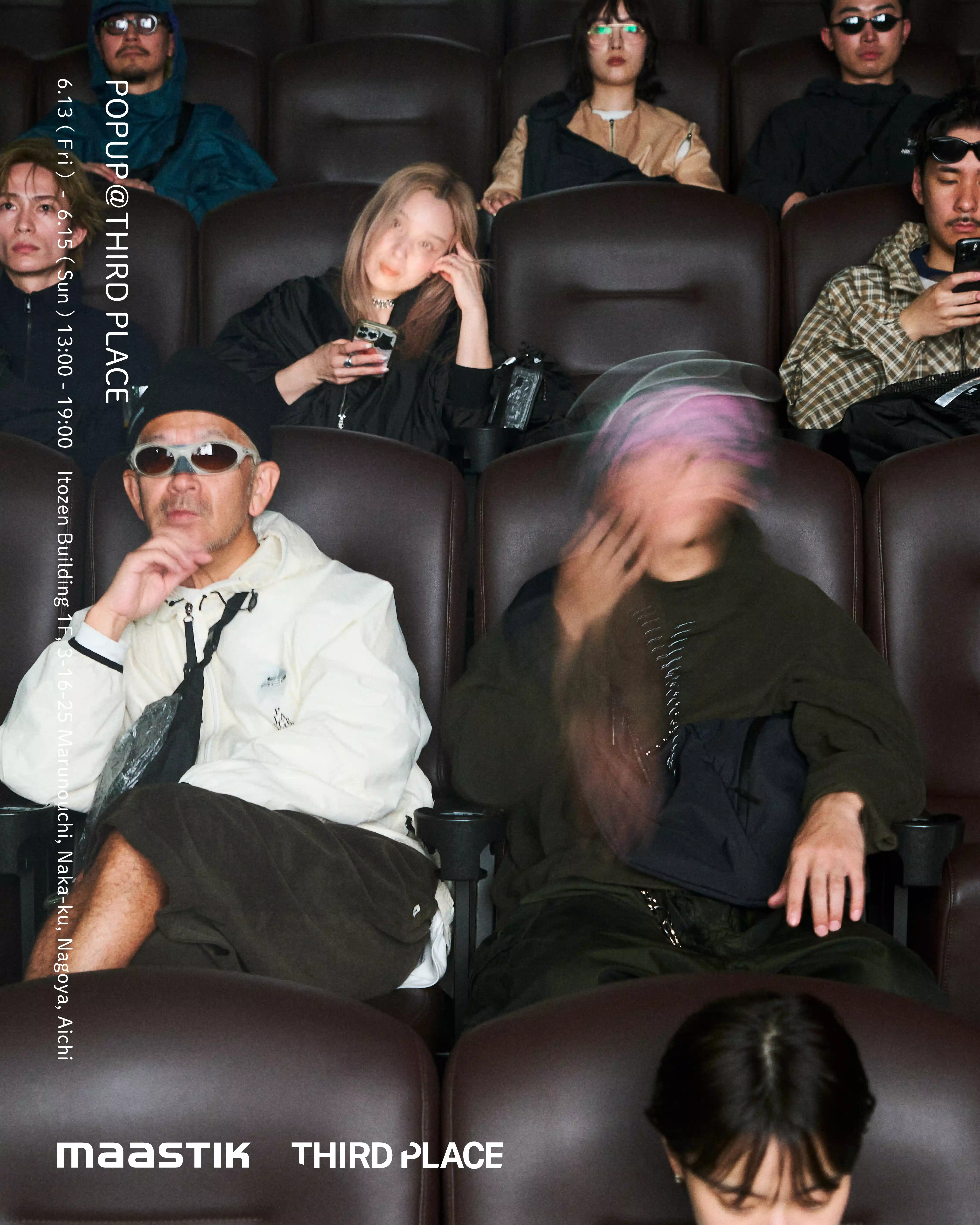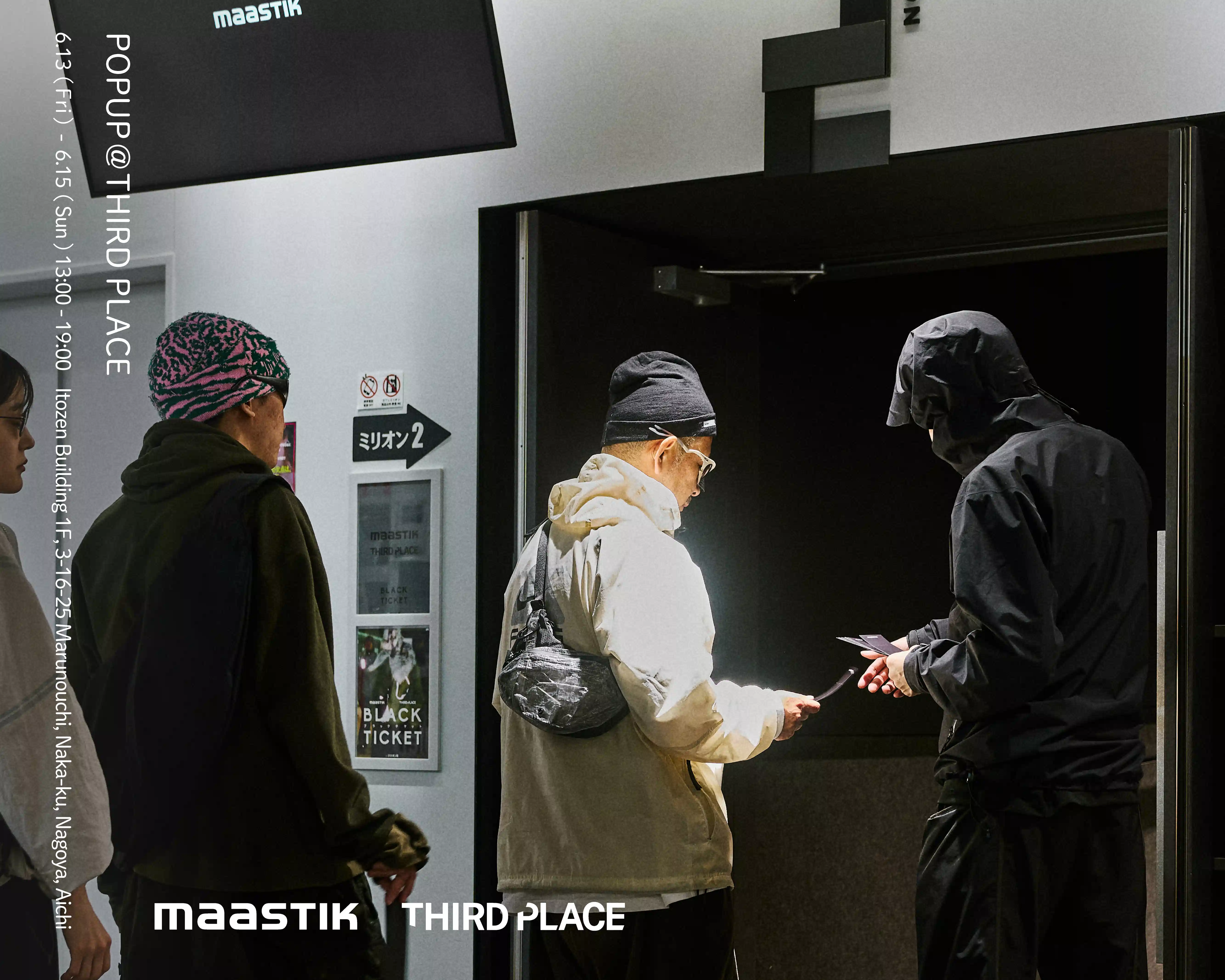 イベントに先立ち、5月某日には名古屋のミニシアター「伏見ミリオン座」にて、秘密の映画試写会をテーマとした新作発表イベント『BLACK TICKET』を開催。招待された10名は<maastik>のアイテムとテックウェアをミックスしたコーディネートで登場し、映画モニターで新作の世界観を体感した。