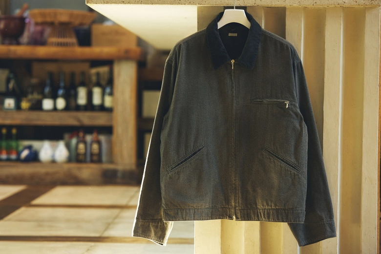 一方、ブルゾンは、肩のプリーツは排除し身頃裏だけ表地無双仕立てに肩傾斜をつけ、袖をナチュラルショルダーにすることで着やすくアレンジされている。ややゆとりを持たせた身幅に対して着丈は短めに設計されており、高密度シャンブレーギャバジンを使用し、シミや汚れでムラのある絶妙な経年変化を表現している。