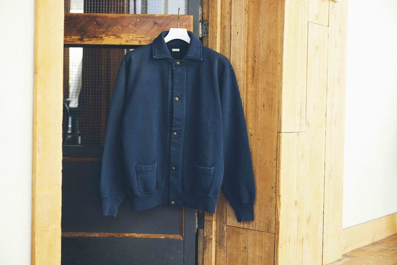 カーディガンスウェットはヴィンテージ感のある短丈で、袖は太くせず適度な太さに設定。裏起毛生地はベースアイテムの糸を解析し作成されている。表糸が少し太番手で裏糸の起毛具合もヴィンテージの経年変化した半起毛が特徴だ。ヴィンテージを踏襲し職人による手作業で色むらやダメージの経年変化を表現している。