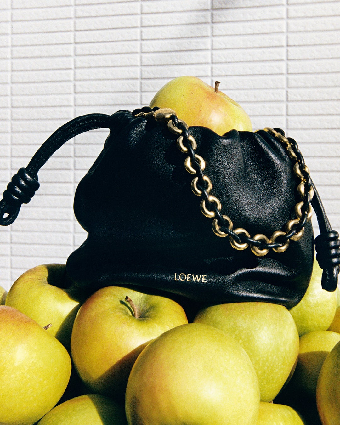 1980年代に発売され、2015年にクリエイティブ ディレクターのジョナサン・アンダーソンにより新たにデザインされたフラメンコは、コイル状のノットでバッグを引き絞ると「フラメンコダンサーのスカート」のような表情があらわれることが特徴。2024春夏コレクションで初登場したフラメンコパースは、フラメンコの特徴的なディテールを、切断面の見えない上質なレザー2枚のみを用いることで再創造した。ドーナツチェーンにはボディと同色のレザーチューブが手仕事で編み込まれ、ジュエリーのような「ペブル」が輝きを添えている。きわめてやわらかなナパラムスキンが採用されており、手触りがよく、デザインに柔軟性を与えている。ドーナツチェーンと、新たに加わったチューブ状のレザーストラップはいずれも着脱・調節可能で、クラッチバッグとして、ショルダーバッグとして、あるいはクロスボディバッグとして身に着けることができる。