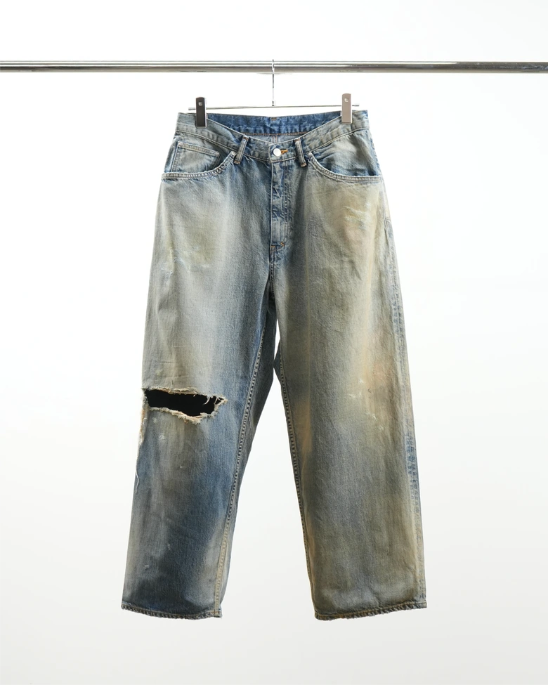このデニムパンツは、定番のストレートシルエットをベースに、左右で異なる加工を施した独特のデザインが特徴。多数の工程を経た加工ながらもバランスの取れた仕上がりで、不均等でありながら完成されたデザインとなっている。価格は40,700円(税込)。