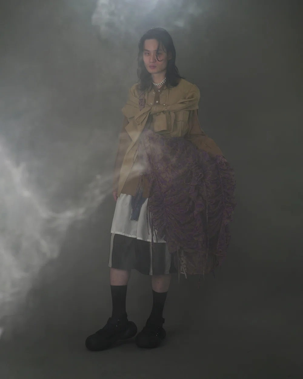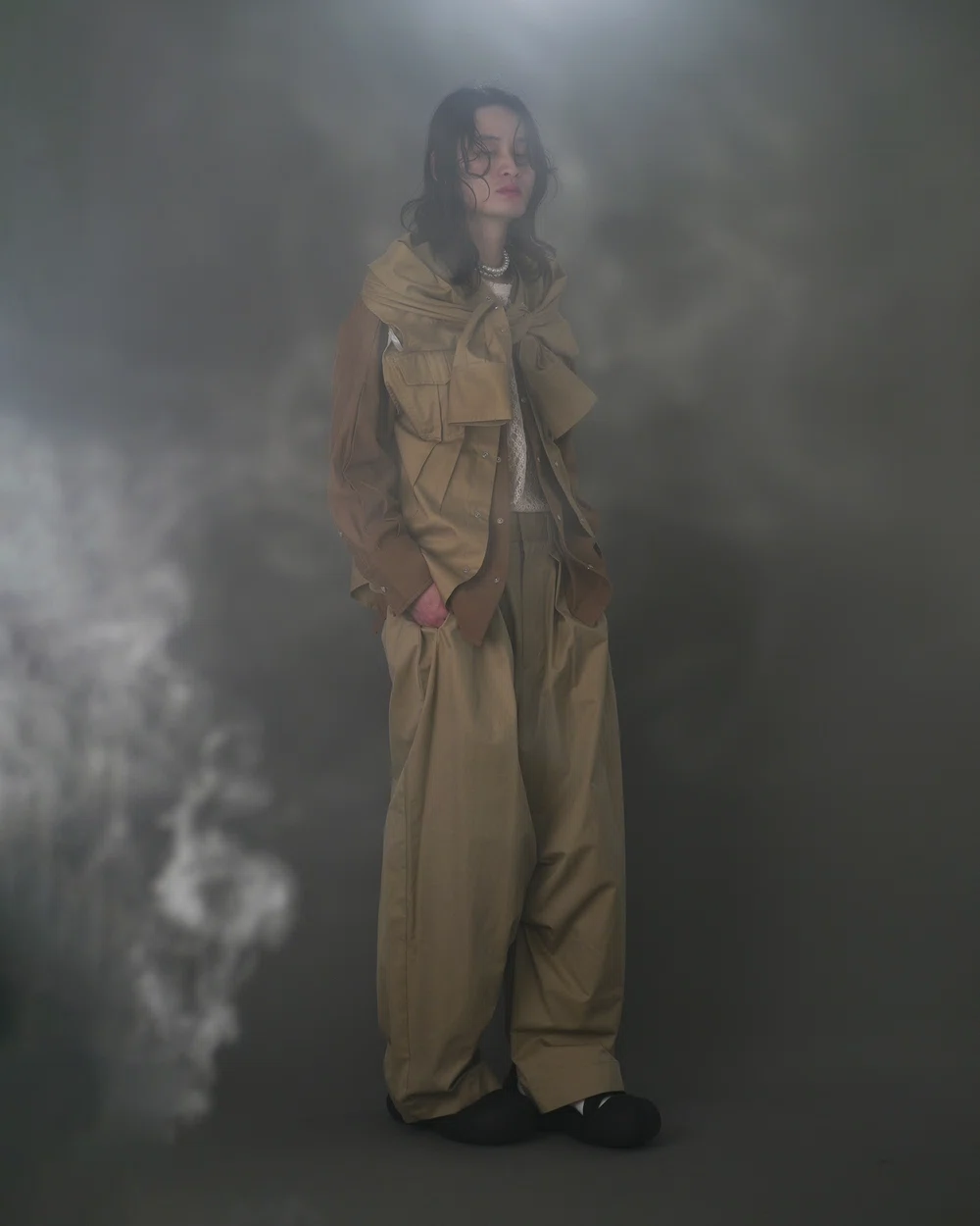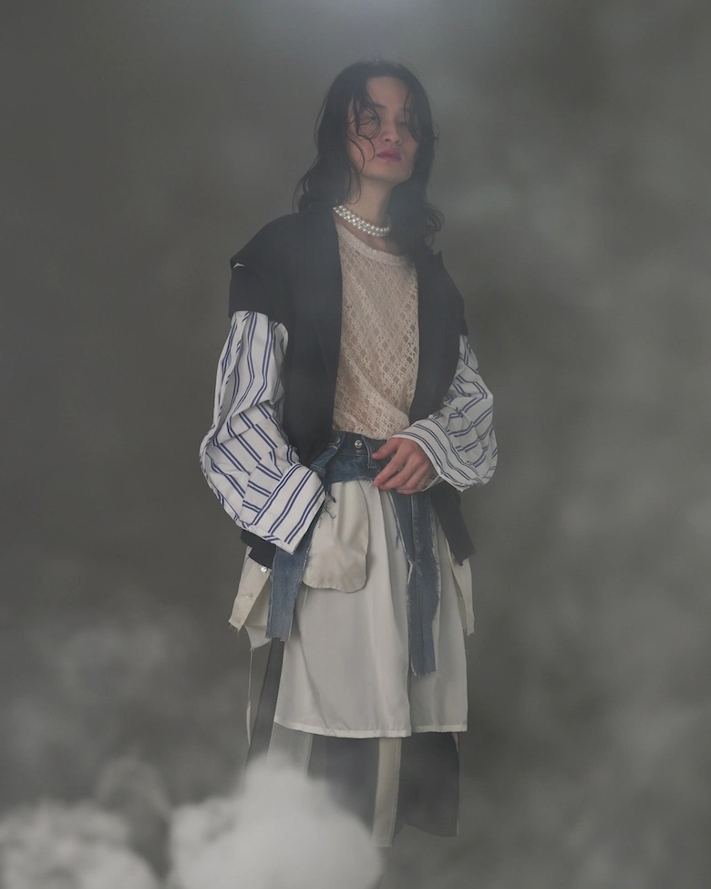 <BASE MARK(ベース マーク)>のデザイナー 金木志穂は、2025春夏よりブランドをスタートした<SAORIUEKI(サオリウエキ)>デザイナー 植木沙織、スタイリストとしてアップサイクルブランド<CYCLEING(サイクリング)>を展開している伏見京子の3名が、<BASE MARK>のアーカイブをベースに古着や再生素材のみを組み合わせて制作。