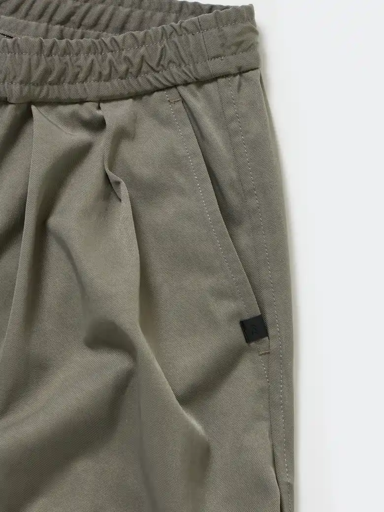 アメリカントラディショナルスタイルの定番である2プリーツショーツをスポーティーにアレンジ。素材の特徴に加え、ウエストと裾にドローコードを配することで、アクティブに動きやすい仕様に仕上げている。