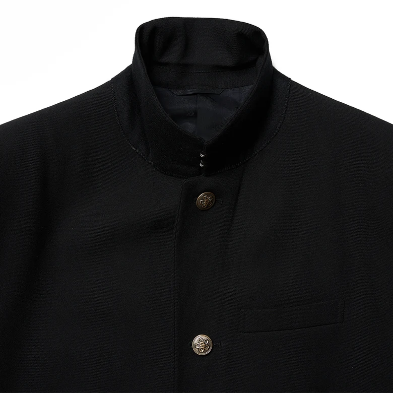 応援団の“長ラン”をモチーフにしたテーラードジャケット。WOOL100%の生地を使用し、高級感と耐久性を両立。