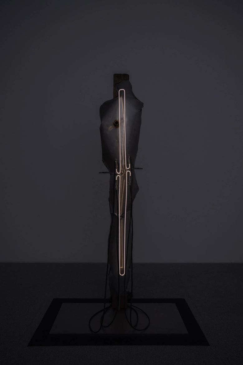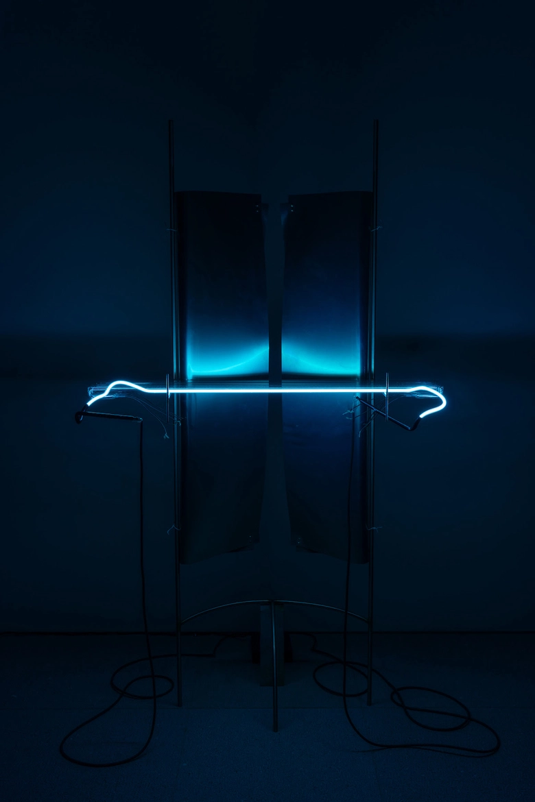 Waku Fukui.「像」形光. 2025. 12mm glass tubes, argon gas, aluminum, stainless steel. 1130 × 2015 × 390 mm. Courtesy of Gallery Common.