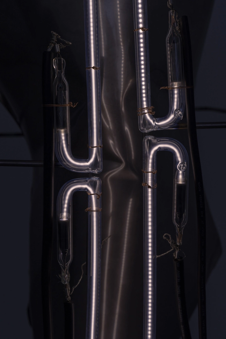 Waku Fukui.「像」形光. 2025. 10mm glass tubes, krypton gas, stainless steel, rubber sheet, wood. 1750 × 1100 × 600 mm.
