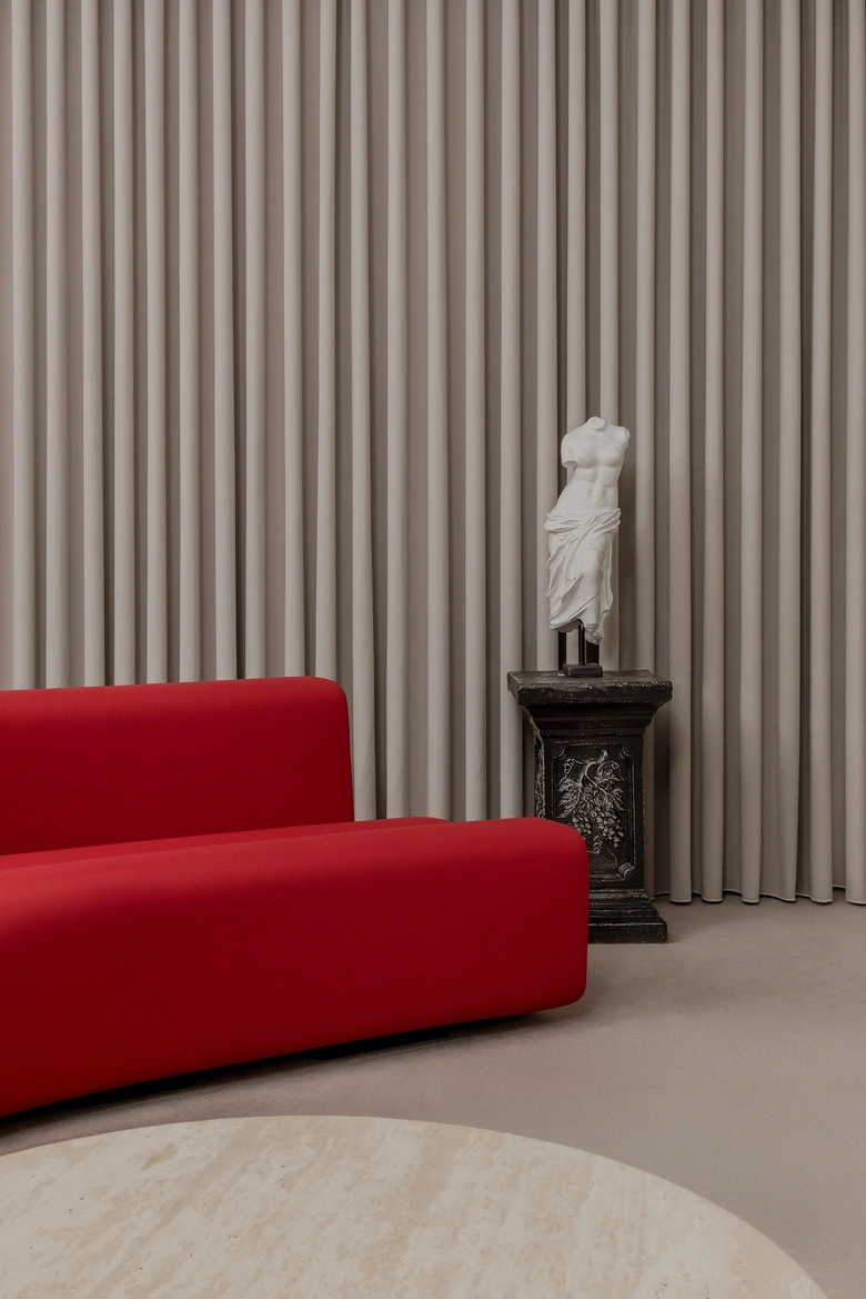 ブティックでは、ピエール・ポランの彫刻的なソファが置かれたプライベートサロンのような空間で、最新コレクションをじっくりと楽しむことができる。また、事前に希望すれば、オンラインストア掲載アイテムを取り寄せて試着・購入することも可能だ。