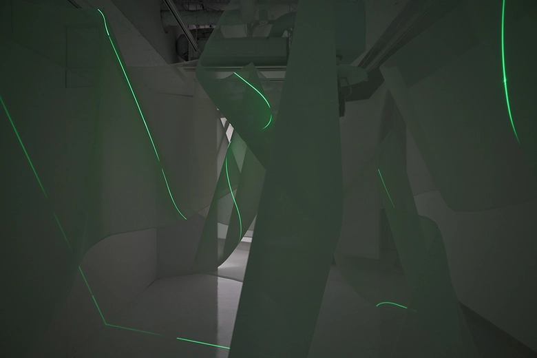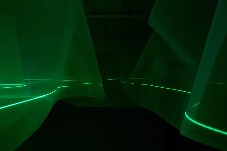 本展示では、「一枚の布、一本の線」というコンセプトのもと、<IM MEN>の衣服づくりを体現する空間が広がる。建築現場で使用される墨出し用のツールを活用し、光の線が布を透過して多面的な表情を生み出すインスタレーションが特徴だ。布を通して投影される光が空間の起伏をトレースし、日常の中に潜む新たな視点を浮かび上がらせる。