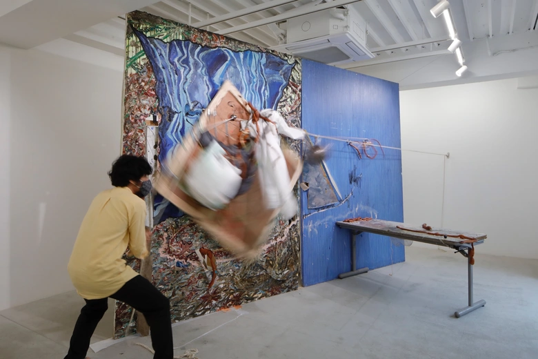 自ら考案したオムライス絵具による可変形態を持つ絵画や、鑑賞者の身体性をも作品に内包させていく運動体をともなう絵画など、既存の概念や枠組みを超え、圧倒的な熱量と鋼の実践のもとに絵画を絵画の牢獄から解放し、未知の領域に引き上げる挑戦を続けるペインターでありパフォーマーである。