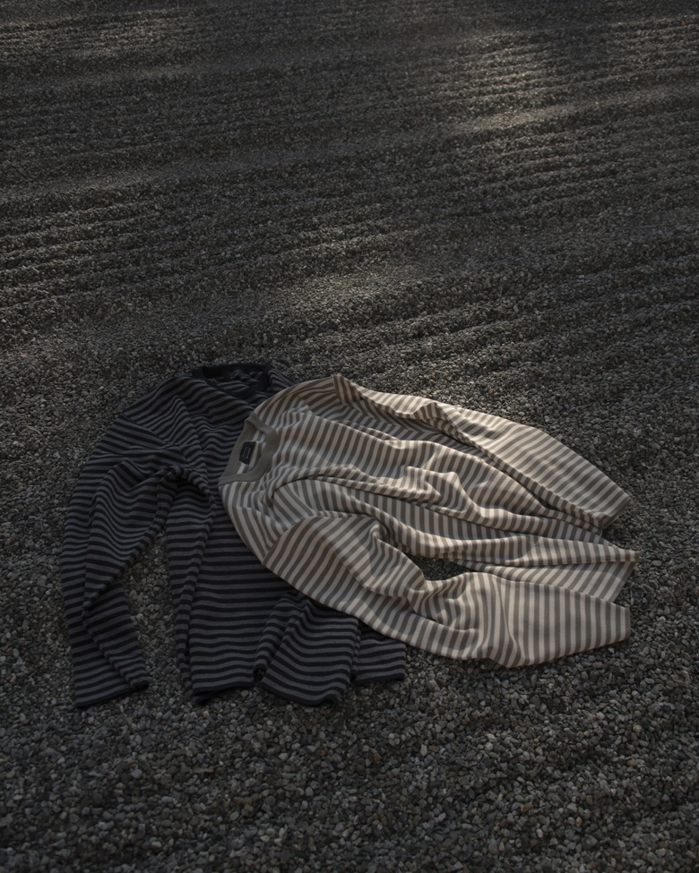 <BATONER>の生産するスムースウールクルーネックには<nanamica>のスタンダードアイテムであるストライプジャージーのピッチをプラスして、両ブランド共に大切にする“次の世代へ受け継がれるモノ”を目指した。また今回のコラボレーションに使用されるブランドネームには<nanamica>のコンセプトである海と奥山メリヤスのある山形県の名峰をイメージしたラインがデザインされている。
