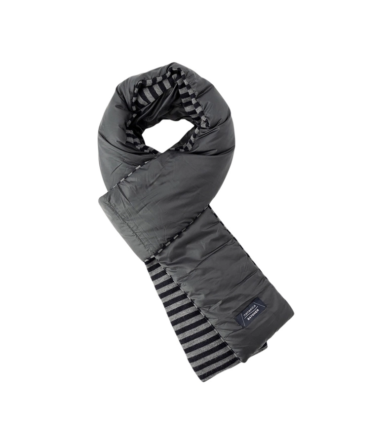 <nanamica>のスタンダードアイテムであるダウンマフラーの表地の製作を<BATONER>へ依頼。希少なハイゲージの編機でゆっくりと丁寧に編まれたスムース地は、網目の隙間を埋めるような組織で滑らかな肌あたりが特徴。体が発する遠赤外線を輻射して保温効果を高める高機能な光電子®ダウンを使用。
