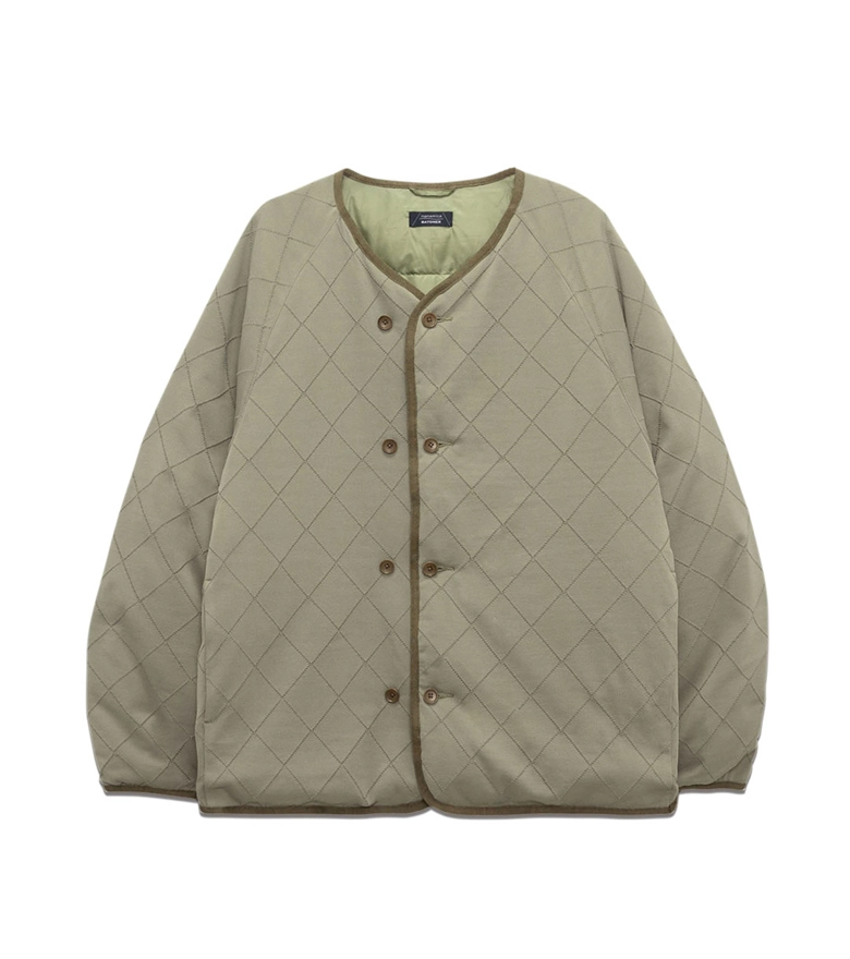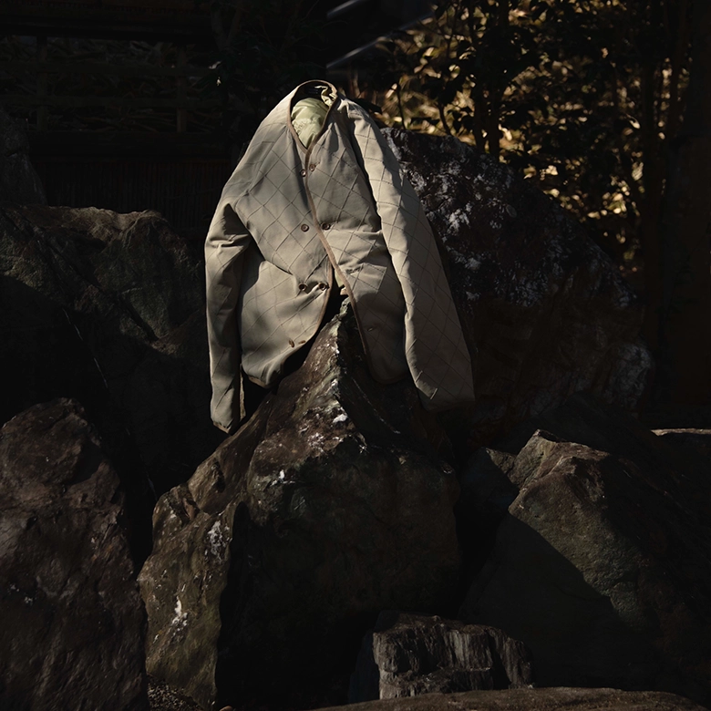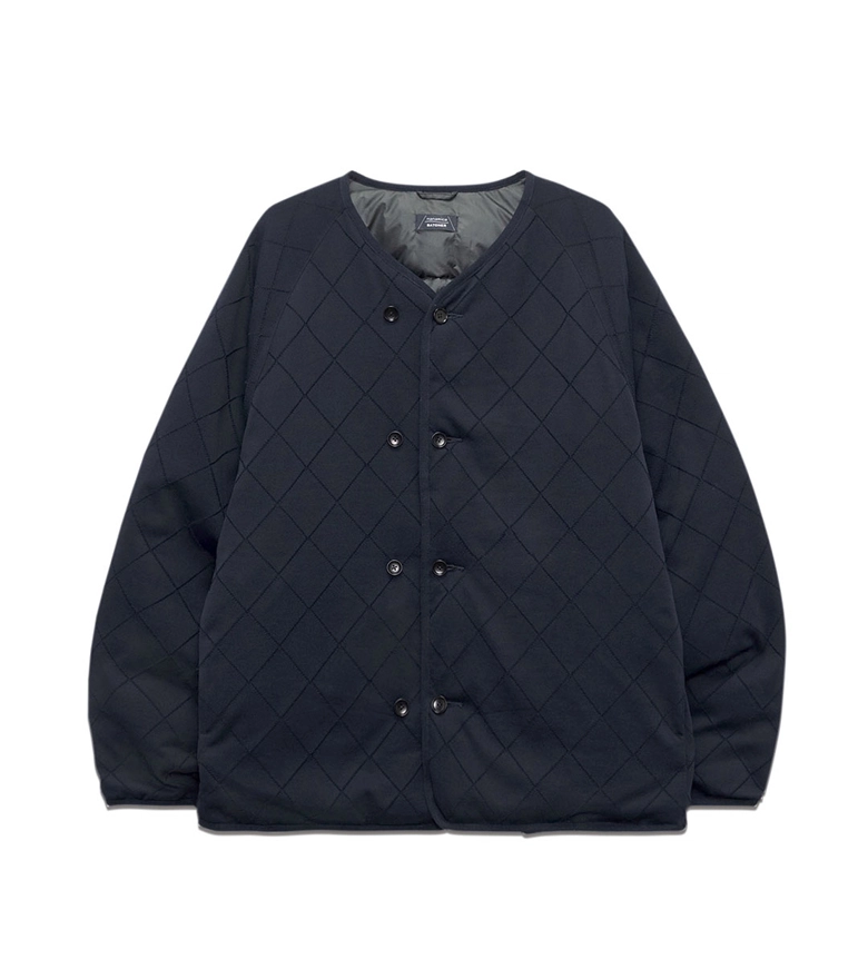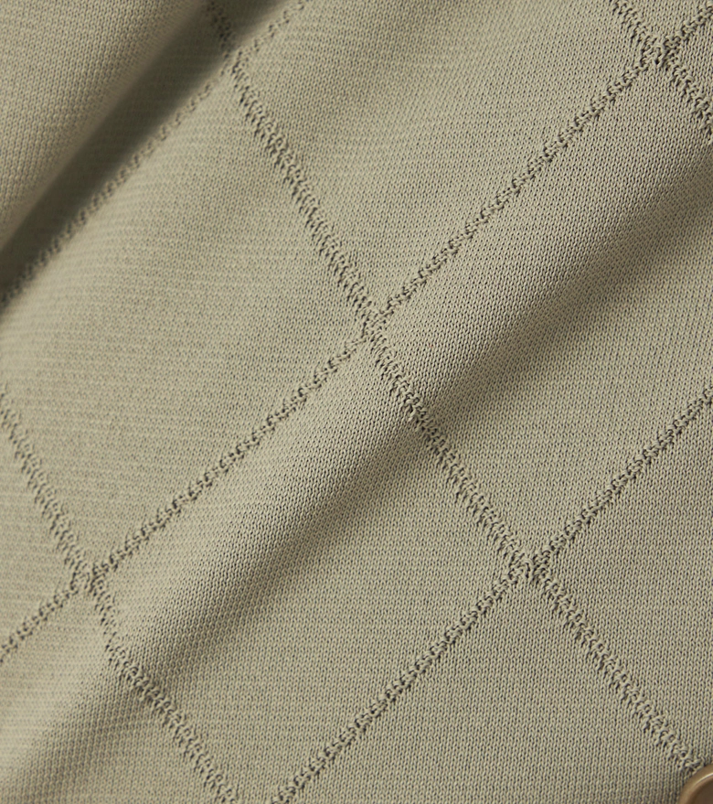 <nanamica>のスタンダードアイテムであるダウンカーディガンの表地の製作を<BATONER>へ依頼。非フッ素系耐久はっ水加工を施したリサイクルポリエステルの糸を使用し、キルティングのダイヤ柄を編地で表現。体が発する遠赤外線を輻射して保温効果を高める高機能な光電子®ダウンを使用。