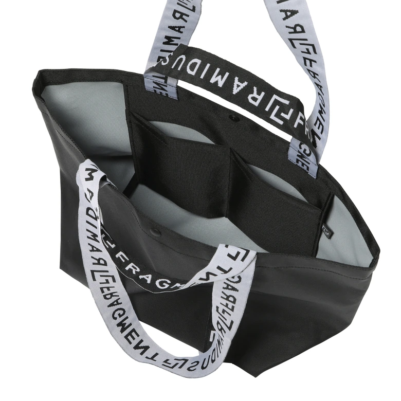 従来モデルからボトムをスクエア型にアップデートした「RAMIDUS SQUARE TOTE BAG」は、MサイズとSサイズの2種類を展開。Mサイズ(W340 H340 D235mm)は13インチのラップトップやA4サイズの書類を収納可能な実用的なサイズで、Sサイズ(W260 H260 D180mm)は財布やモバイルフォン、ポーチなどの必需品をコンパクトに収納できる仕様となっている。どちらも手持ちと肩掛けの2WAY仕様で、ハンドル部分には両ブランドのロゴが織り込まれた特別仕様のテープを採用している。