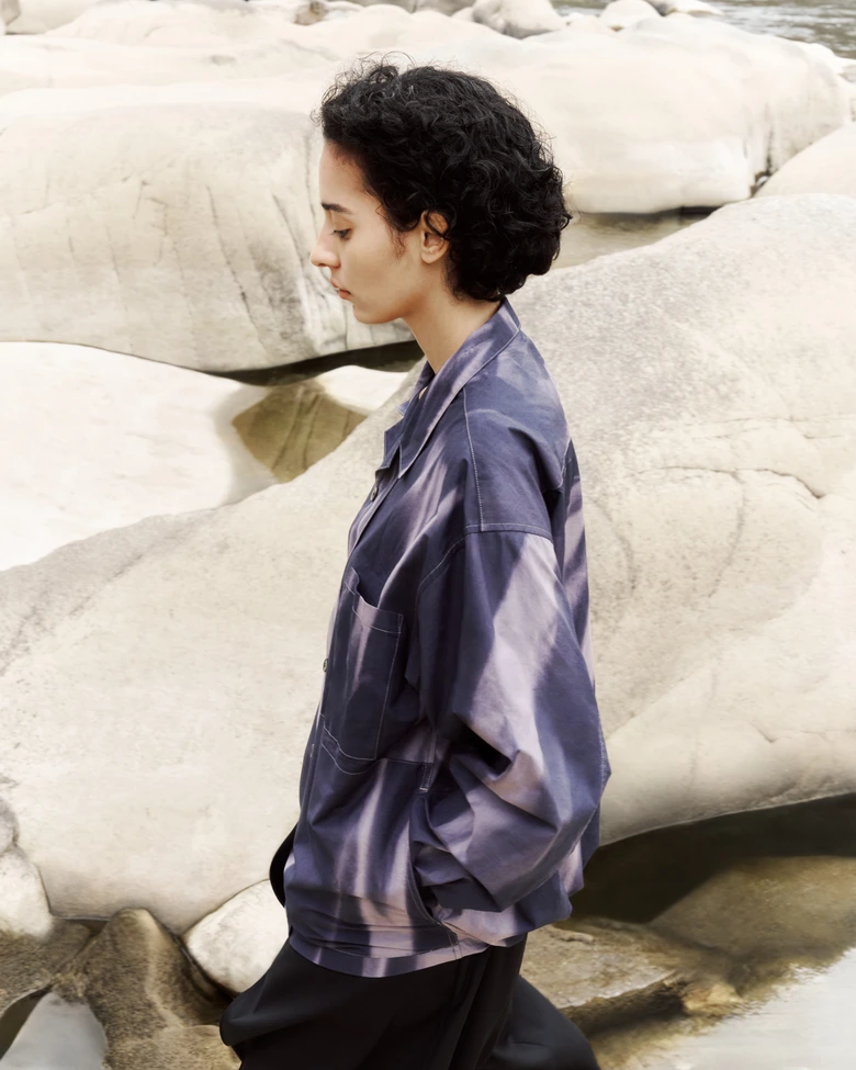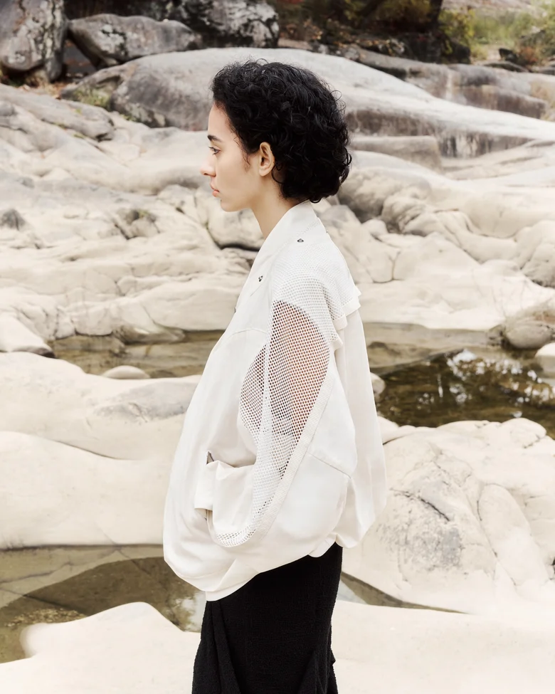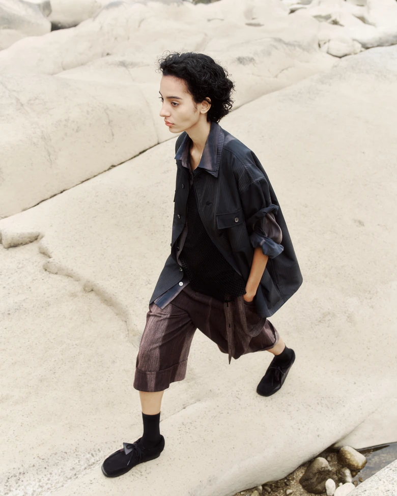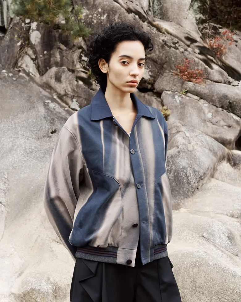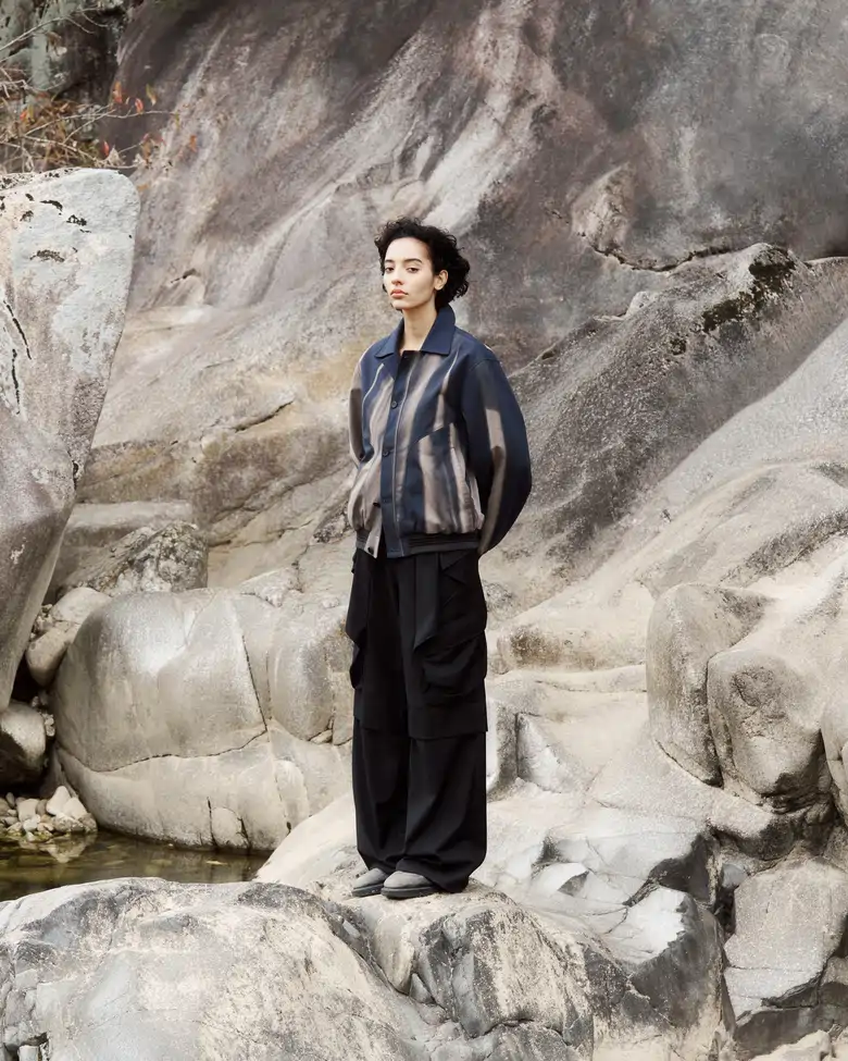 <JiyongKim>は、2021年春夏シーズンにローンチされて以来、独創的なデザインとサステナブルな取り組みで注目を集めるブランド。デザイナーのJiyong Kimは文化服装学院、Central Saint Martinsを卒業後、<LEMAIRE(ルメール)>やVirgil Ablohディレクションの<LOUIS VUITTON(ルイ・ヴィトン)>で経験を積んだ経歴を持つ。彼のコレクションは、ヴィンテージ生地や工場で余ったナイロン素材を使用し、日光を活用した「サンフェード」技術による独自の染色方法を取り入れるなど、環境負荷を抑えた製作プロセスが特徴だ。