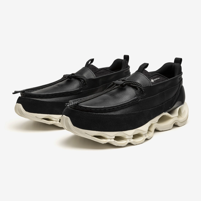 「WAVE PROPHECY MOC GTX」は、<MIZUNO>独自の『INFINITY WAVE』ソールユニットを搭載し、機能性とデザイン性を融合させた1足。クラシックなモカシンシューズのデザインを取り入れつつ、『インターナルソックフィットシステム』構造を採用することで、フィット感と快適性を向上させている。
