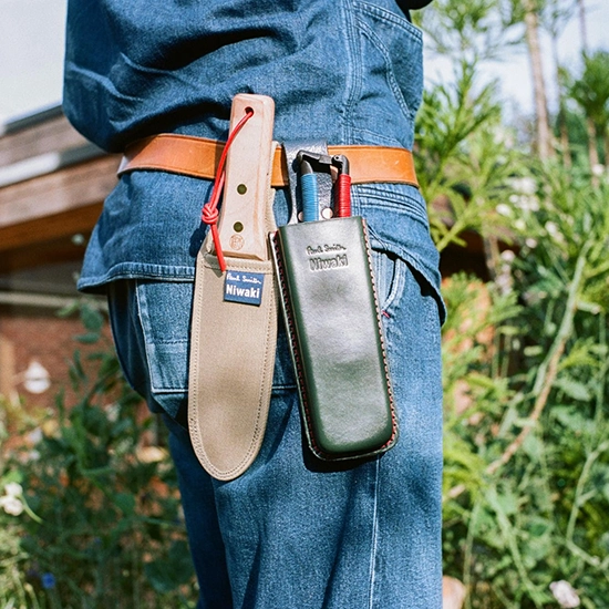 コレクションには、鍛造炭素鋼の剪定ばさみや、兵庫県三木市の職人が手掛けた園芸ナイフ、カラフルなレザーを使用したガーデニングバッグなど、多彩なアイテムが揃う。特に、剪定ばさみにはレザーコードが巻かれ、ホルスターにはネイビーとダークグリーンのレザーが用いられたデザインが特徴的だ。また、園芸ナイフは鋭いカーボンスチール製の刃とブナのハンドルが魅力で、専用キャンバスシースが付属する。