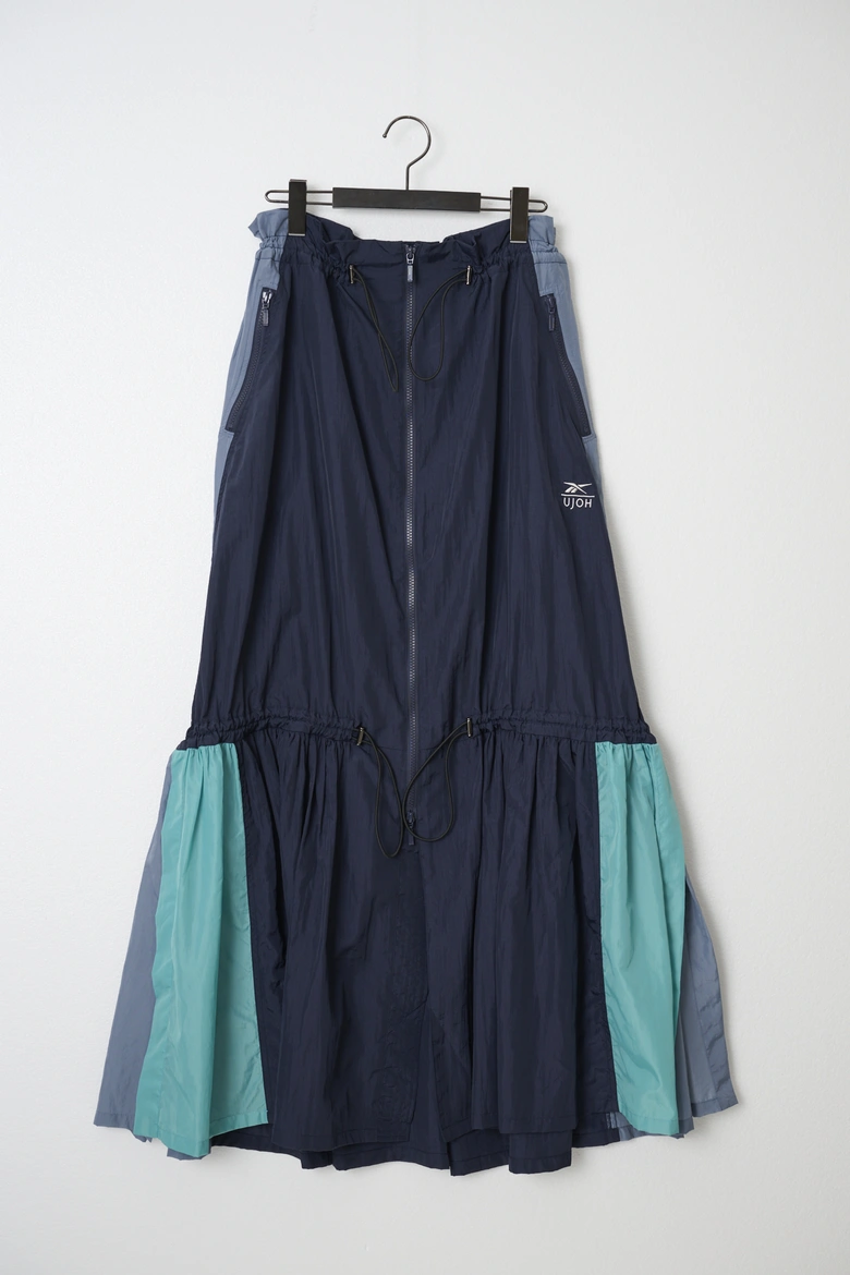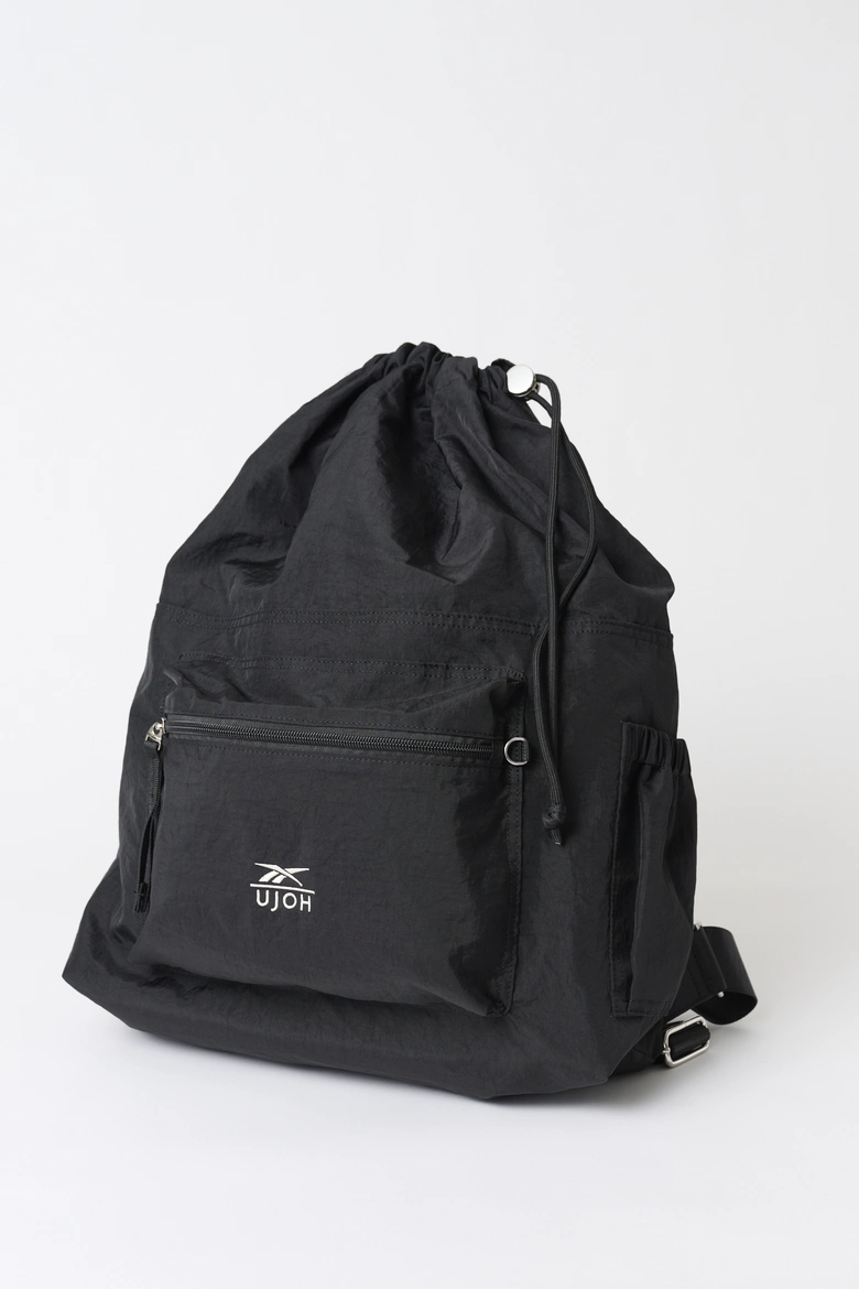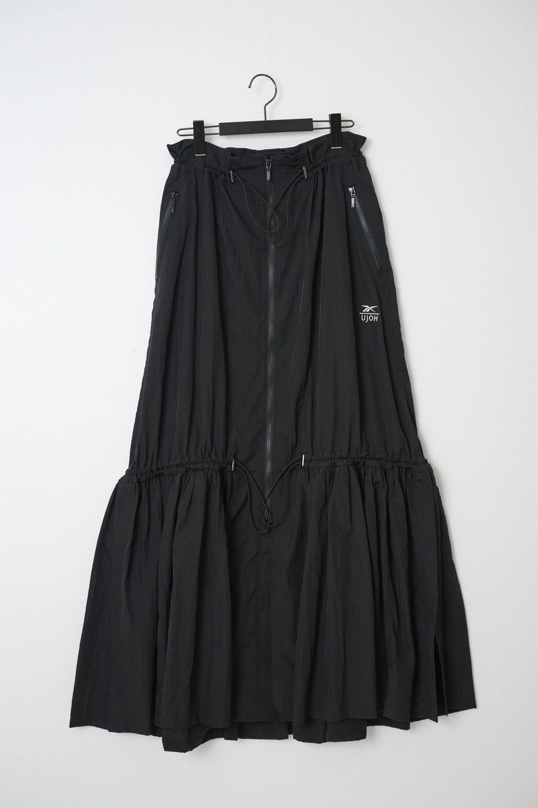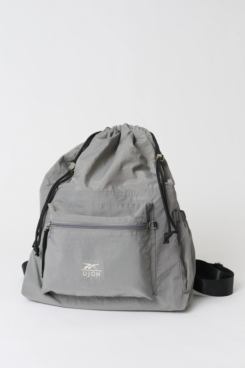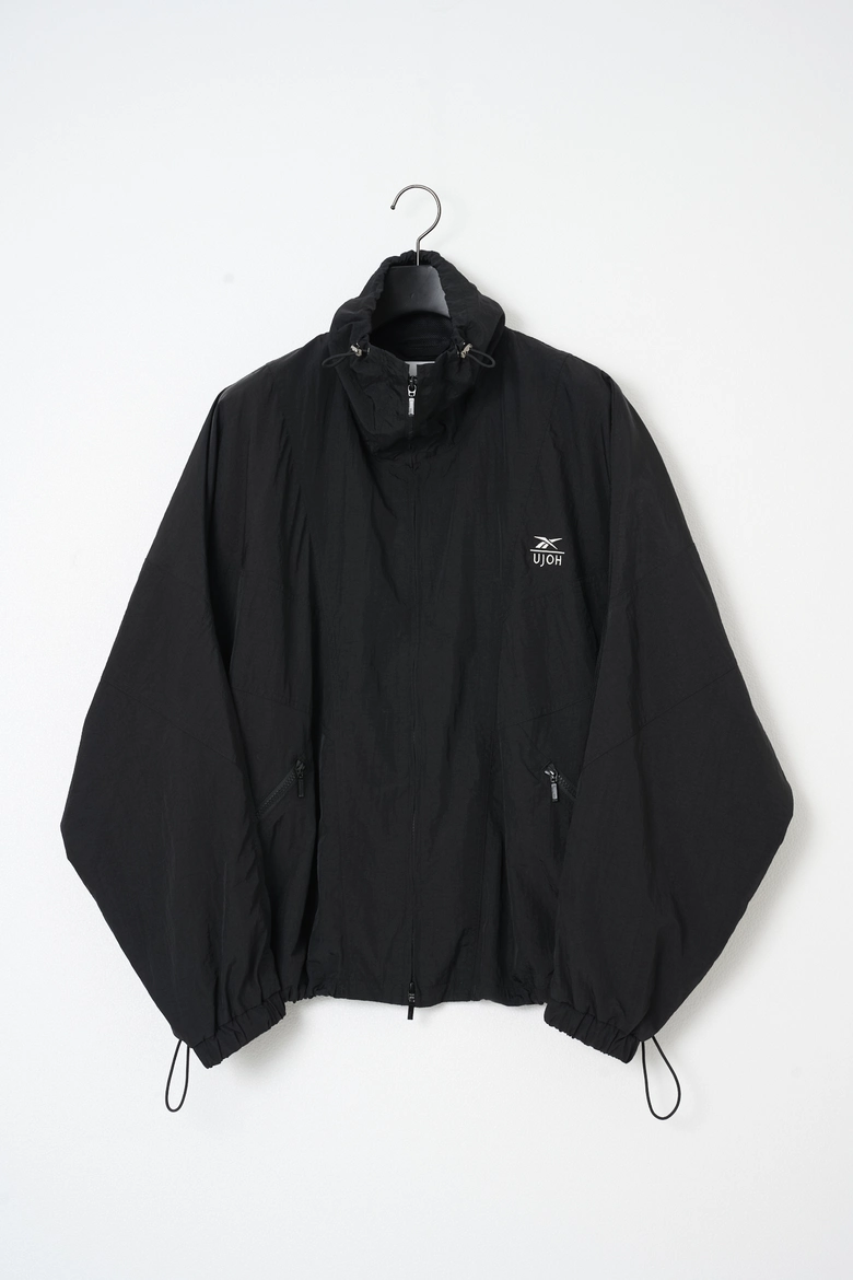 今回のコレクションでは、軽量かつ撥水性のあるナイロンワッシャー素材を採用。<UJOH>ならではの立体的なパターンや贅沢な布使い、ブランドのアイコニックなディテールであるドローコードなどが、アクティブウェアの要素と融合し、新たなスタイルを生み出している。