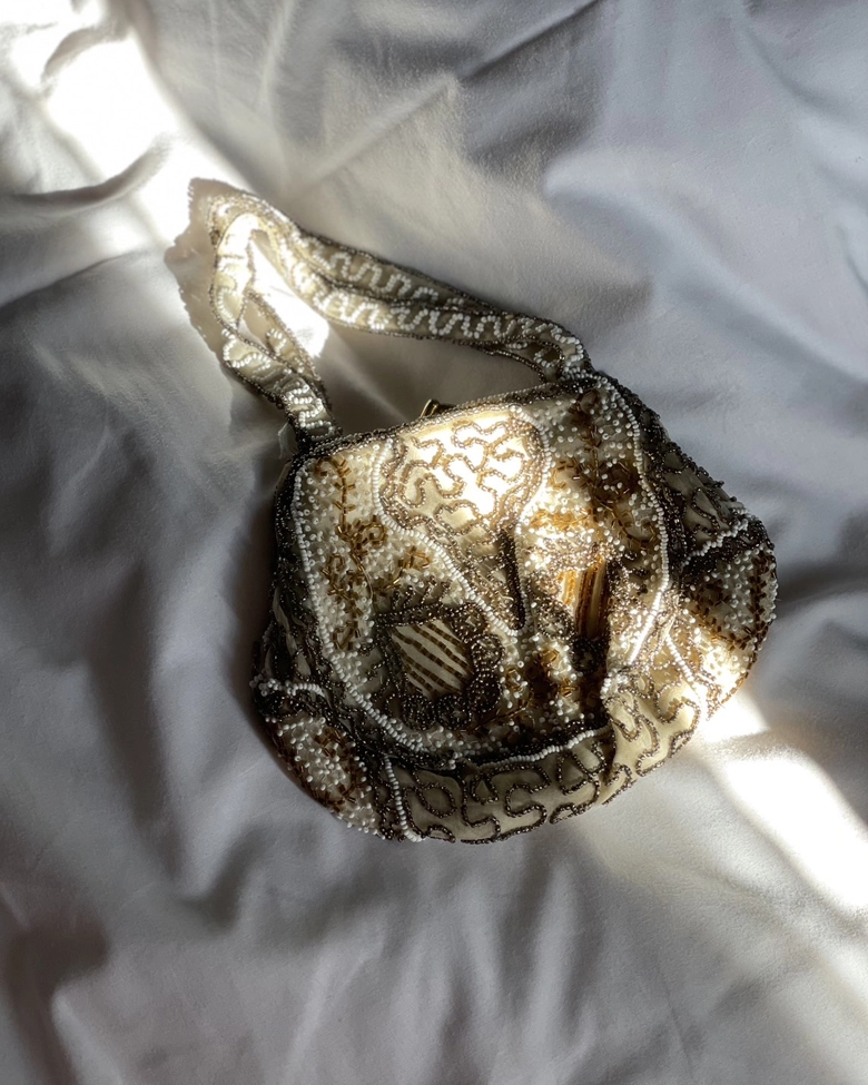 ヴィンテージ品を独自の視点で集積し、ヨーロッパから買い付けたインテリア雑貨を販売。特に、フランスのオパリンガラスを使用した「Vintage flower vase」(¥12,100)や、ベルギーの「Vintage bag」(¥30,800)が注目される。
